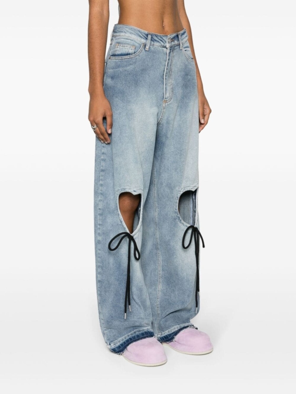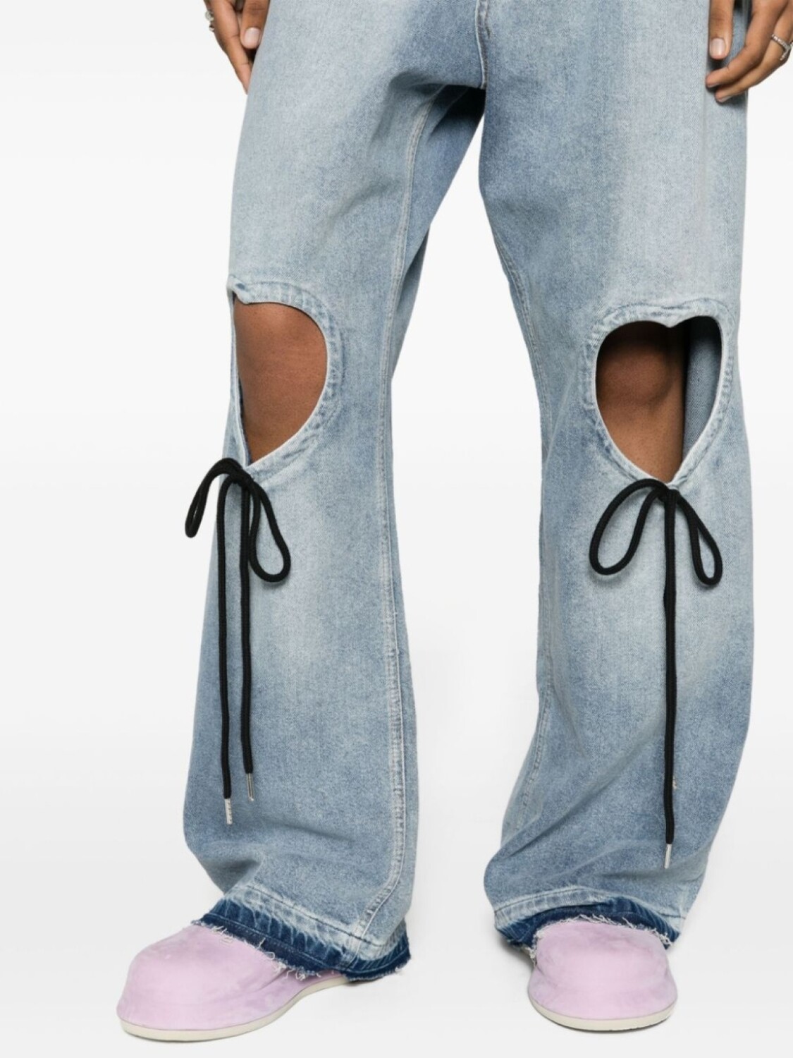 Голубой, хлопок, деним, эффект потертости, вырезные детали, кулиска, петли для ремня, нашивка с логотипом сзади, ширинка на пуговицах, пять карманов и необработанный подол.