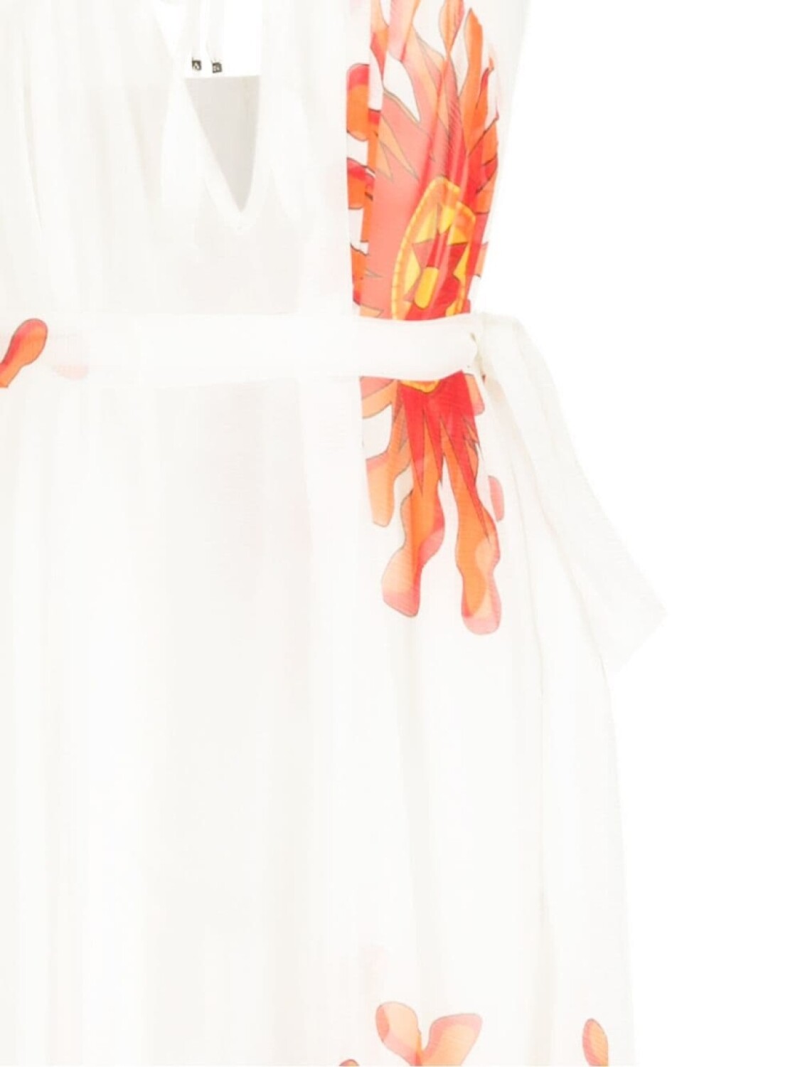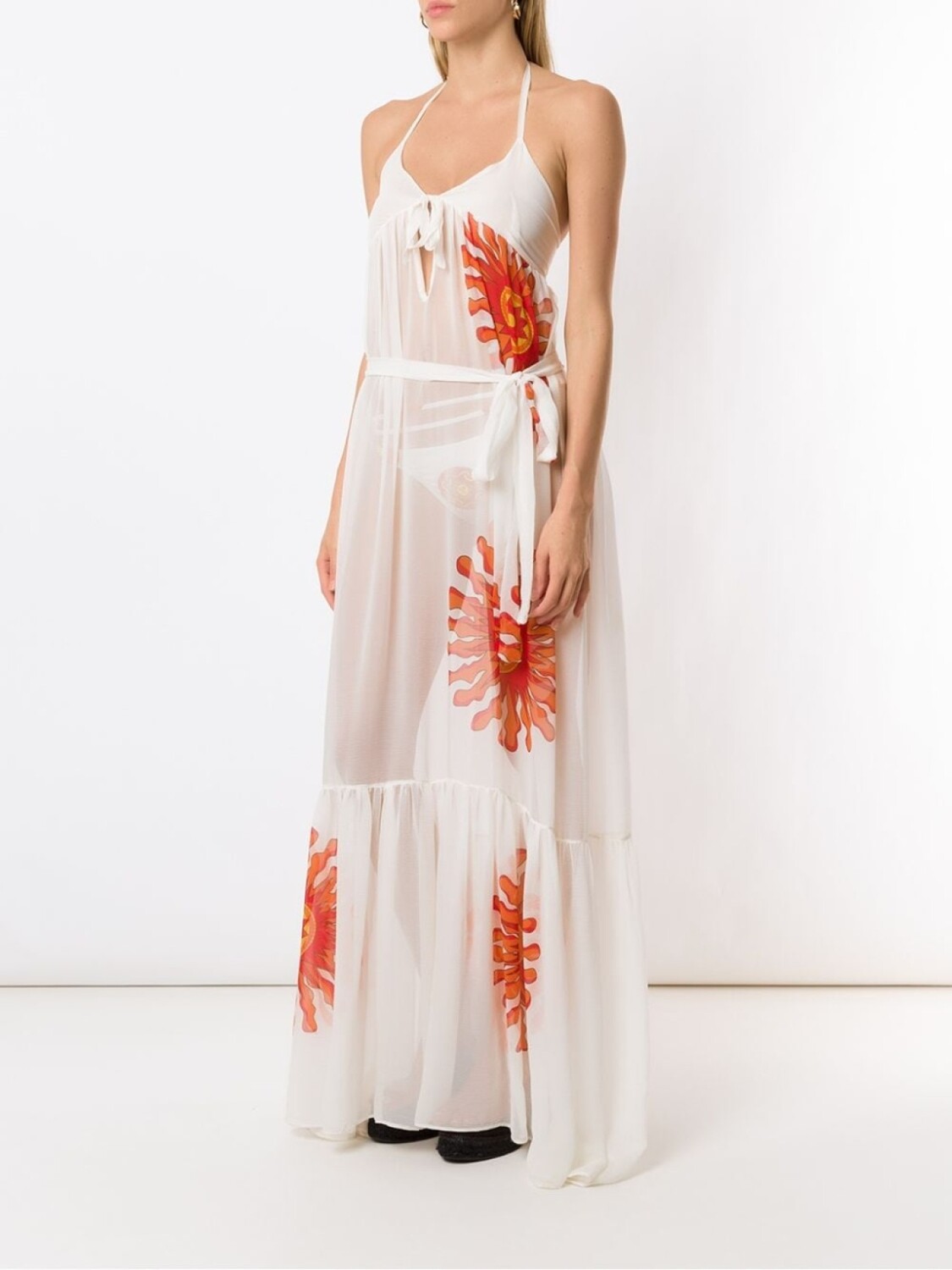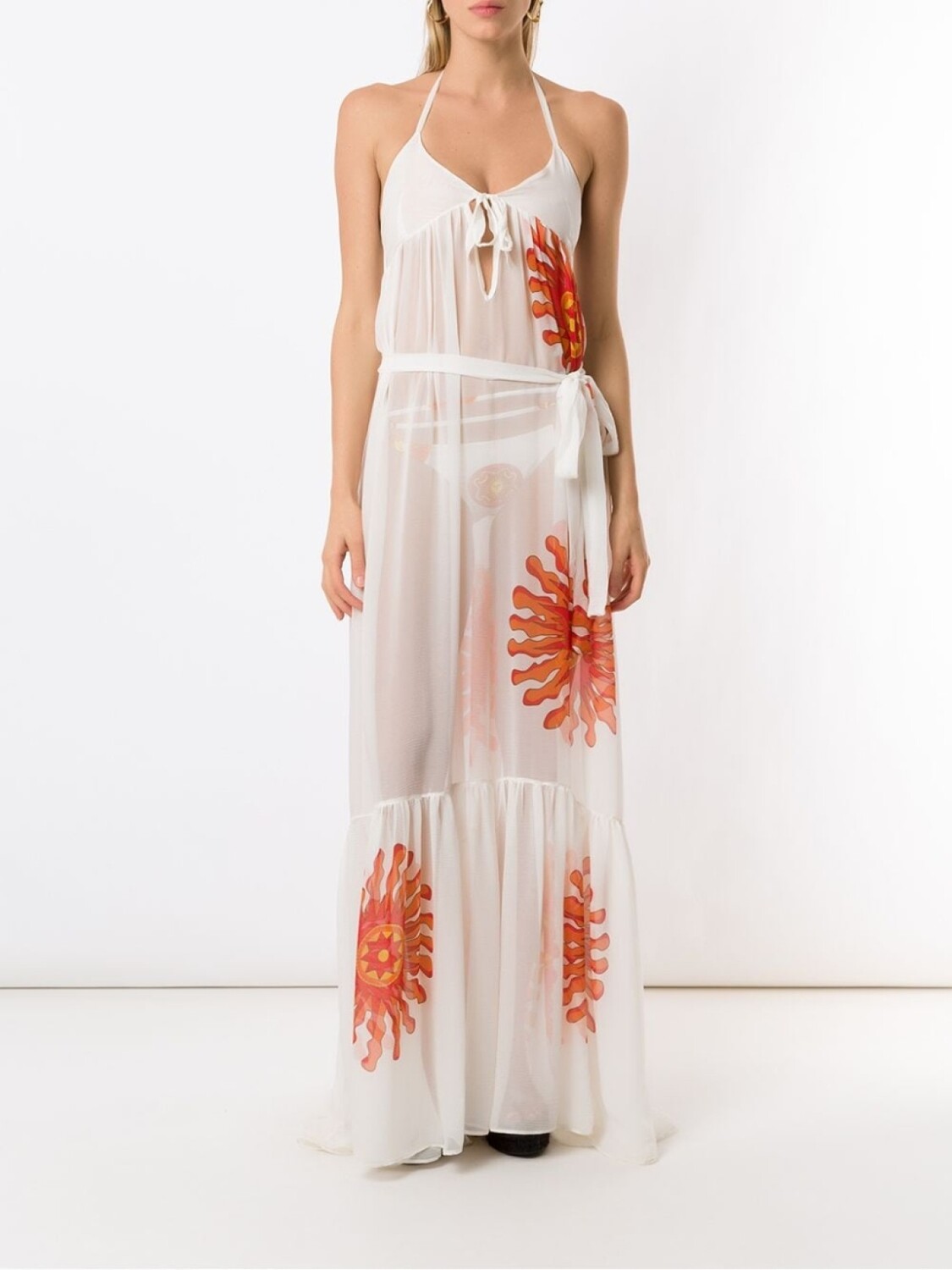 Длинное платье от Amir Slama. V-образная горловина, тонкие лямки-спагетти, сплошной узор, талия на завязке и свободный крой. Цвет: белый.
