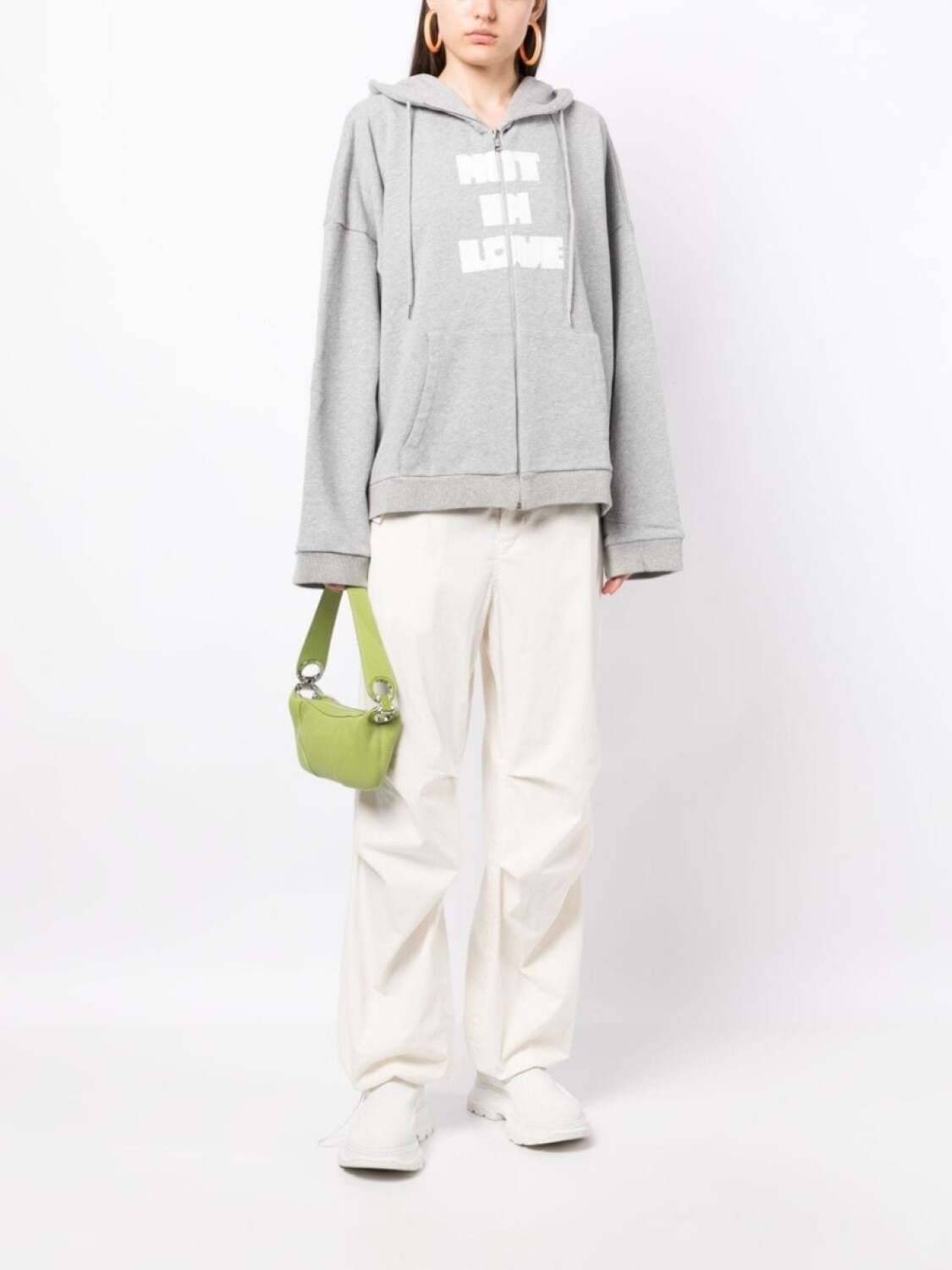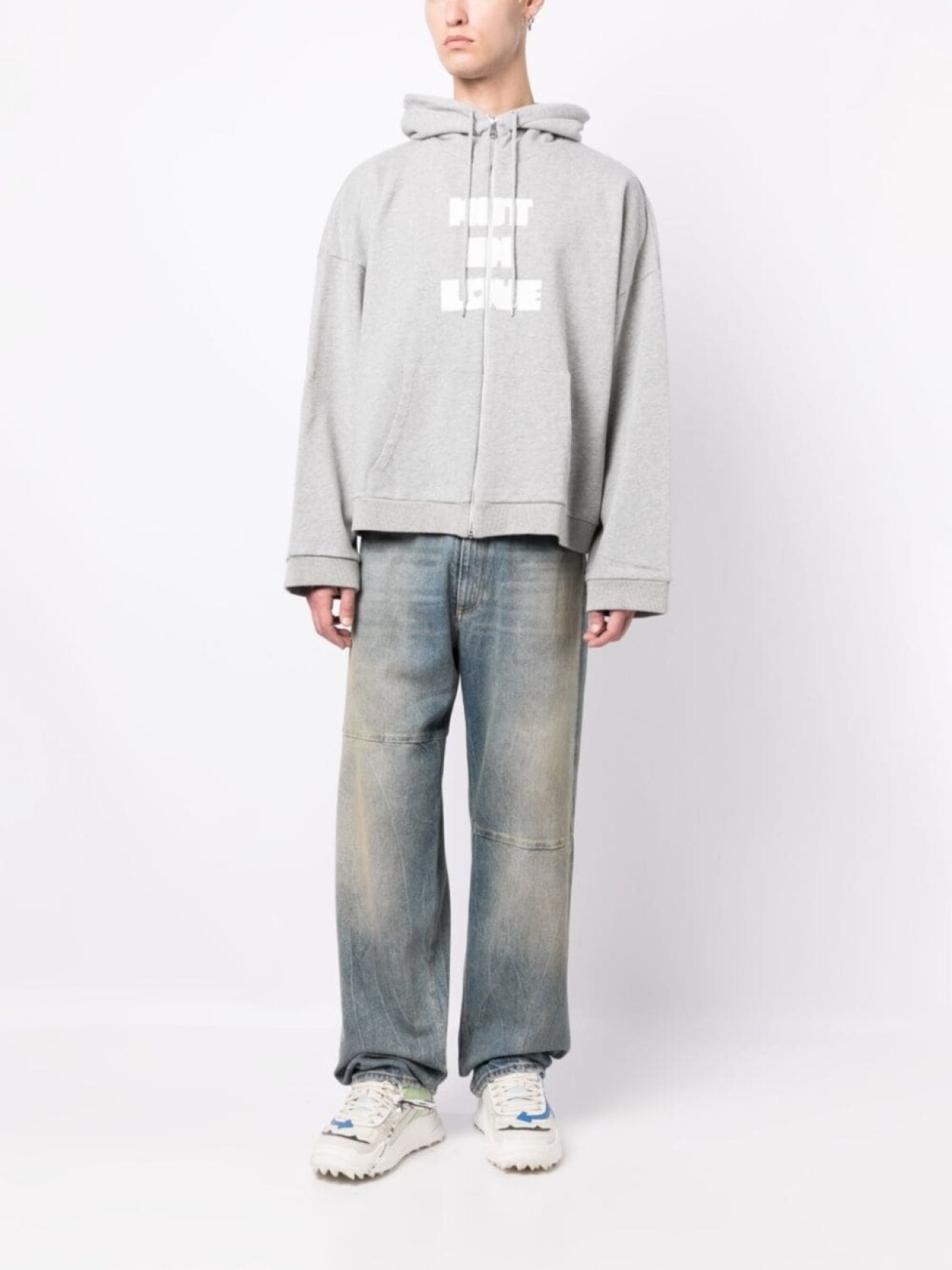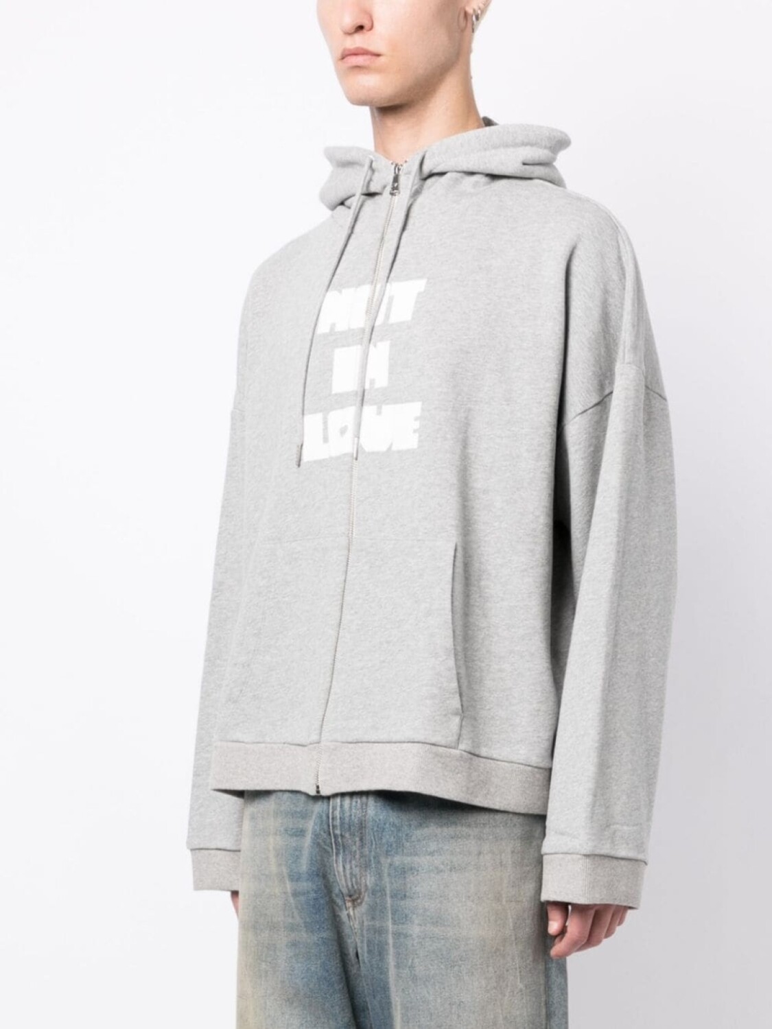 Серый, хлопок, текстовый принт, затягивающийся на шнурок капюшон, застежка на молнии спереди, два передних кармана, длинные рукава и прямой подол. Это унисекс-модель. Обратите внимание, что для нее используется мужская размерная сетка.