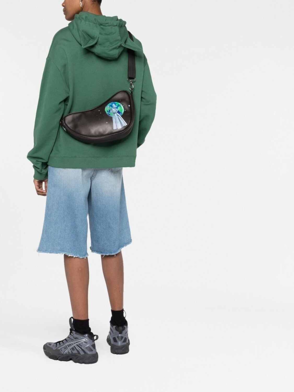 Черный, кожа, графичный принт спереди, принт с надписью сзади, съемный регулируемый ремень на плечо, застежка на молнии сверху и основное отделение.