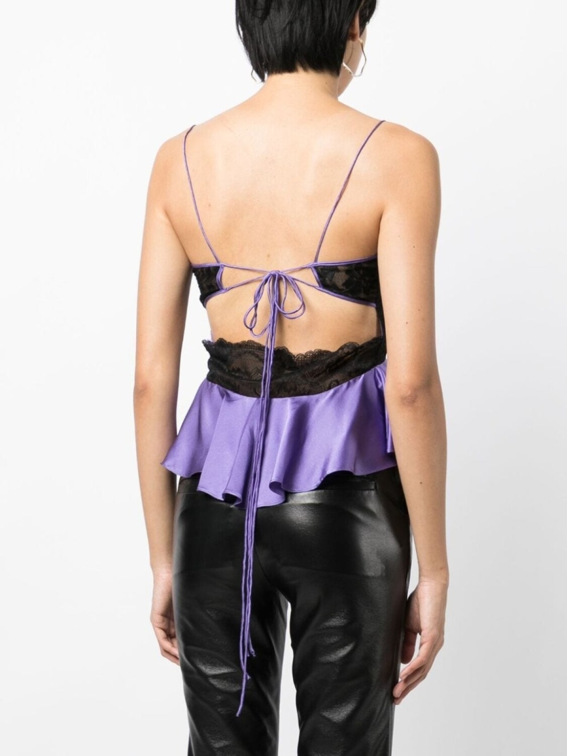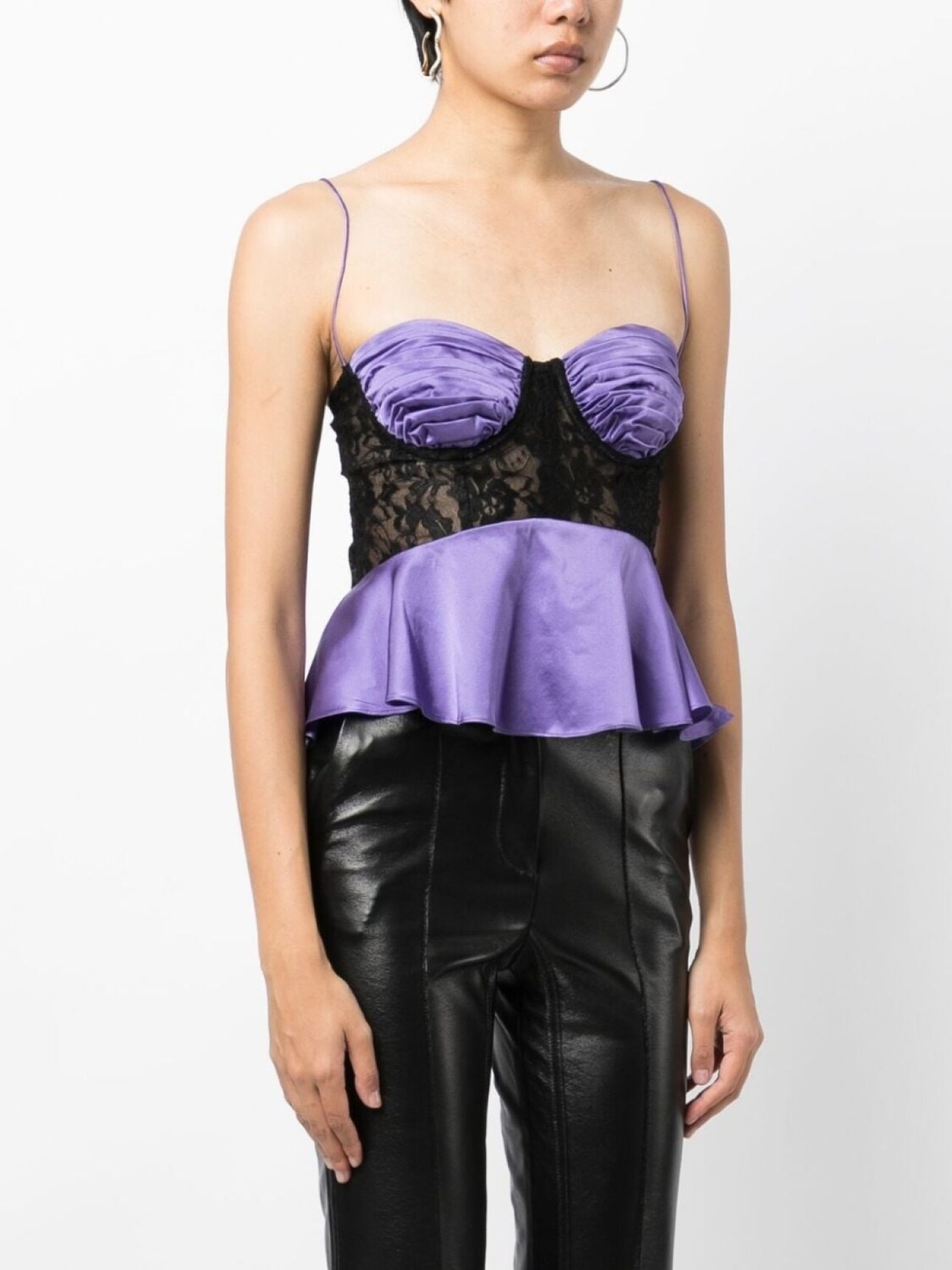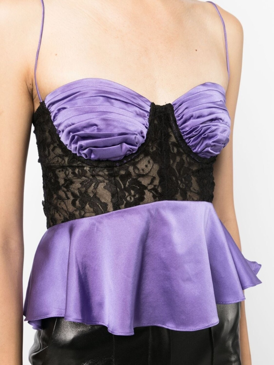 Черный, насыщенно-фиолетовый, смесовый шелк, кружевные вставки, края с фестонами, эластичный материал, вырез в форме сердца, формованная чашка, тонкие бретели, без рукавов, драпировка и застежка на завязке сзади.