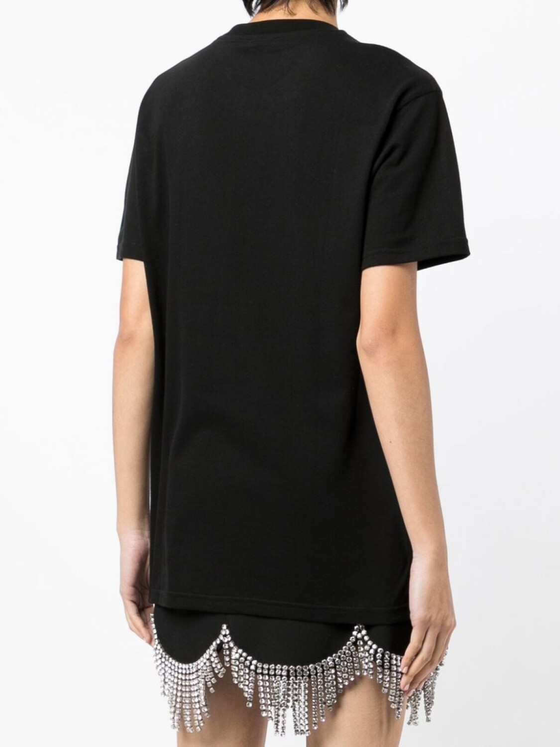 Черный, хлопок, логотип спереди, круглый вырез, короткие рукава и прямой подол.