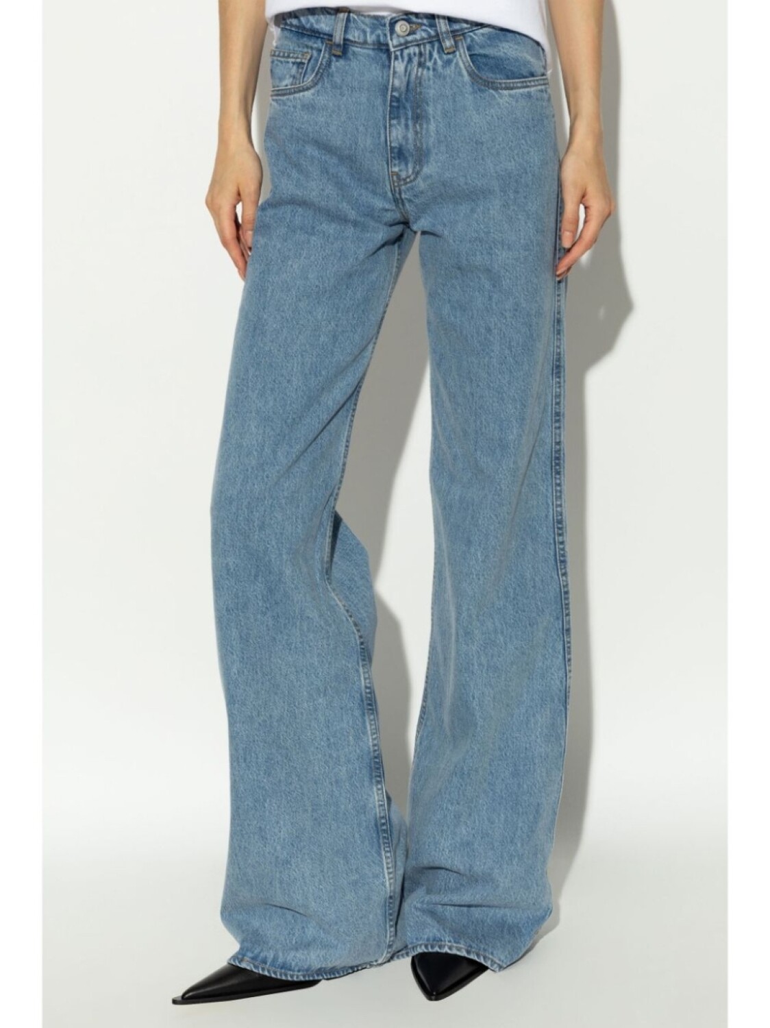 Синий хлопковый деним, нашивка с логотипом сзади, средняя посадка, шлевки для ремня, застежка на пуговицы и молнию спереди, классические пять карманов, широкие штанины, удлиненная длина
