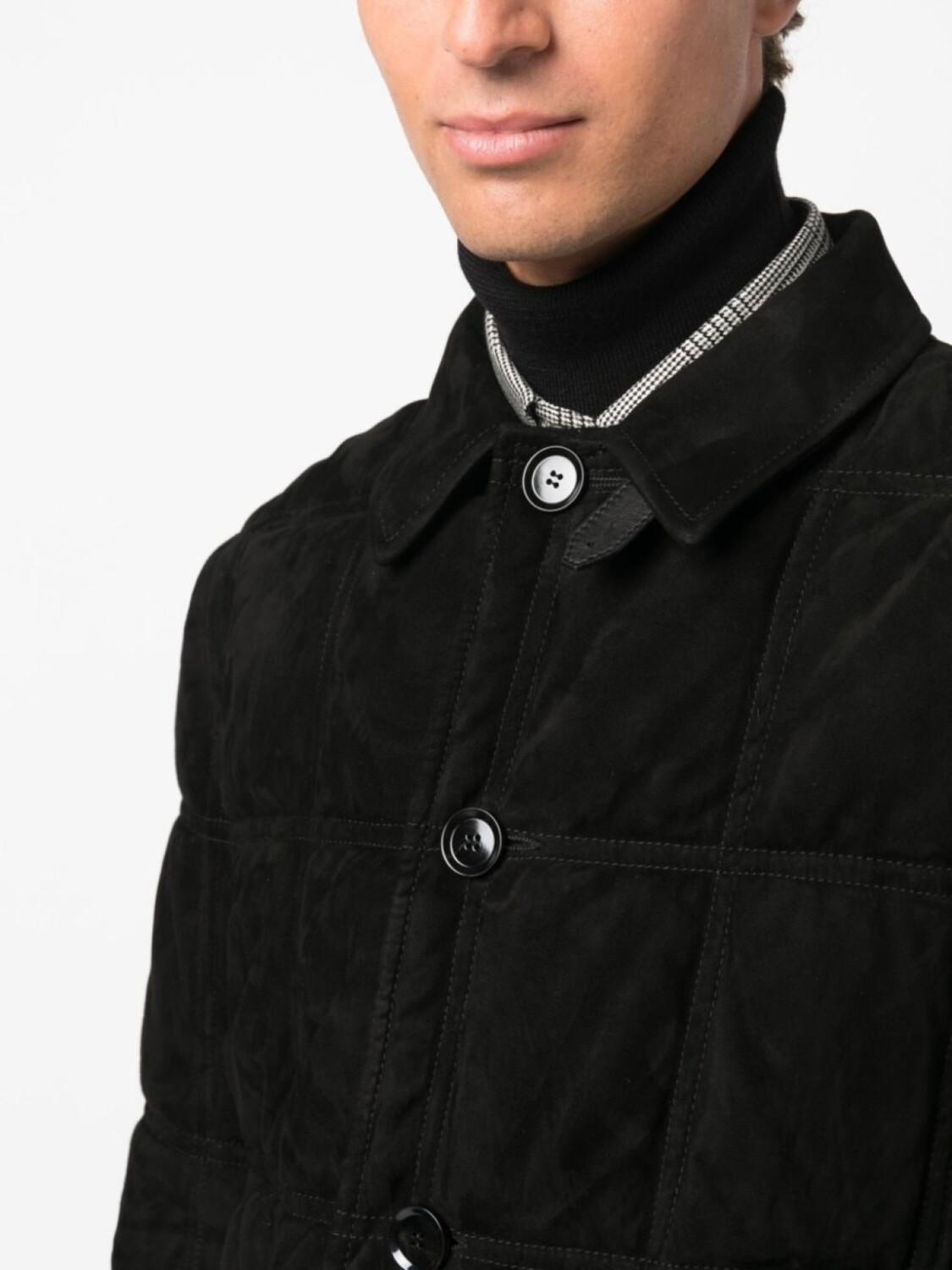 Черный, кожаная отделка, стеганая отделка, воротник-труба, застежка на пуговицах спереди, длинные рукава, два кармана с клапанами по бокам и прямой подол.
