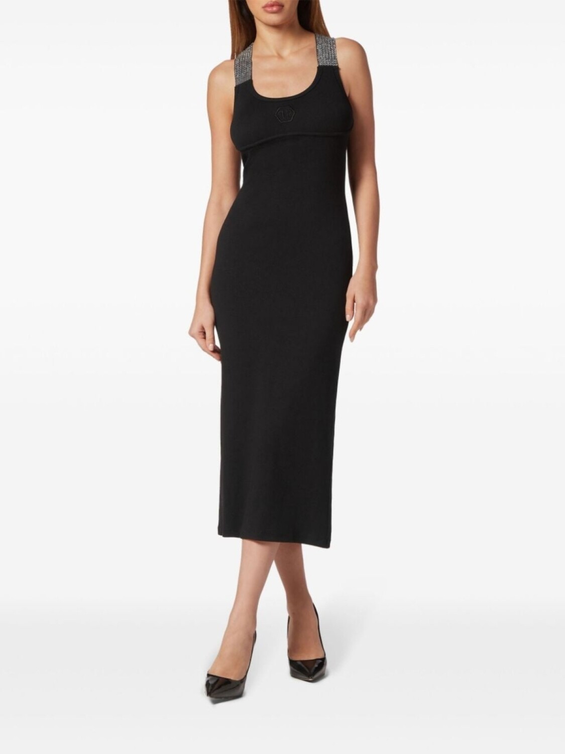 Черный, эластичный материал, ткань в мелкий рубчик, вышитый логотип спереди, кристаллы, U-образный вырез, без рукавов, вырез рейсер, вырез сзади, прямой подол, длина ниже колена