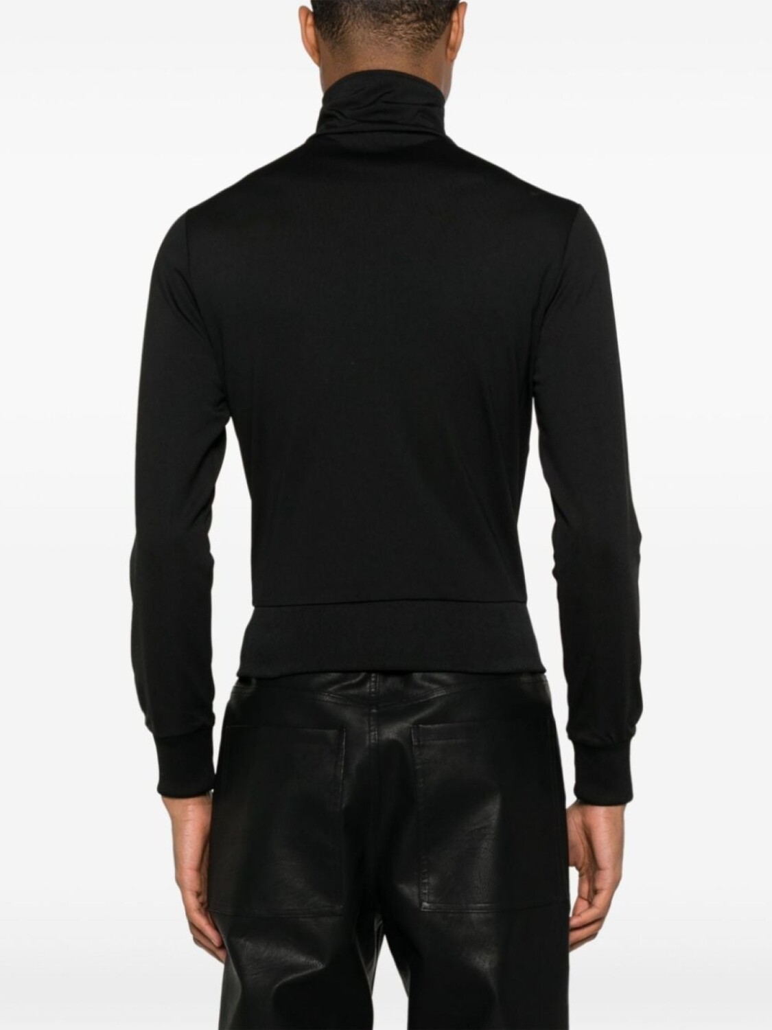Черный, воротник-труба, треугольные вырезы, серебристая фурнитура, два кармана на молнии по бокам, длинные рукава, подол и манжеты в рубчик, застежка на молнии спереди