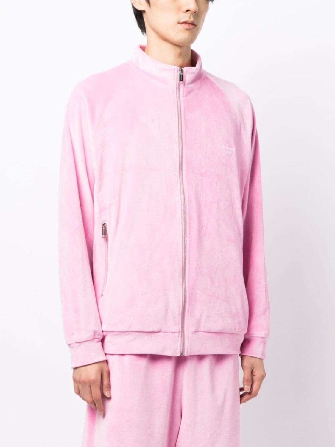 Светло-розовый, стрейчевая ткань, матовый эффект, жатый эффект, вышитый логотип на груди, отделка металлическими люверсами, воротник-стойка, застежка на молнии спереди, длинные рукава реглан, рукава с узкими манжетами, прямой подол и два кармана на молнии по бокам. Это унисекс-модель. Обратите внимание, что для нее используется мужская размерная сетка.