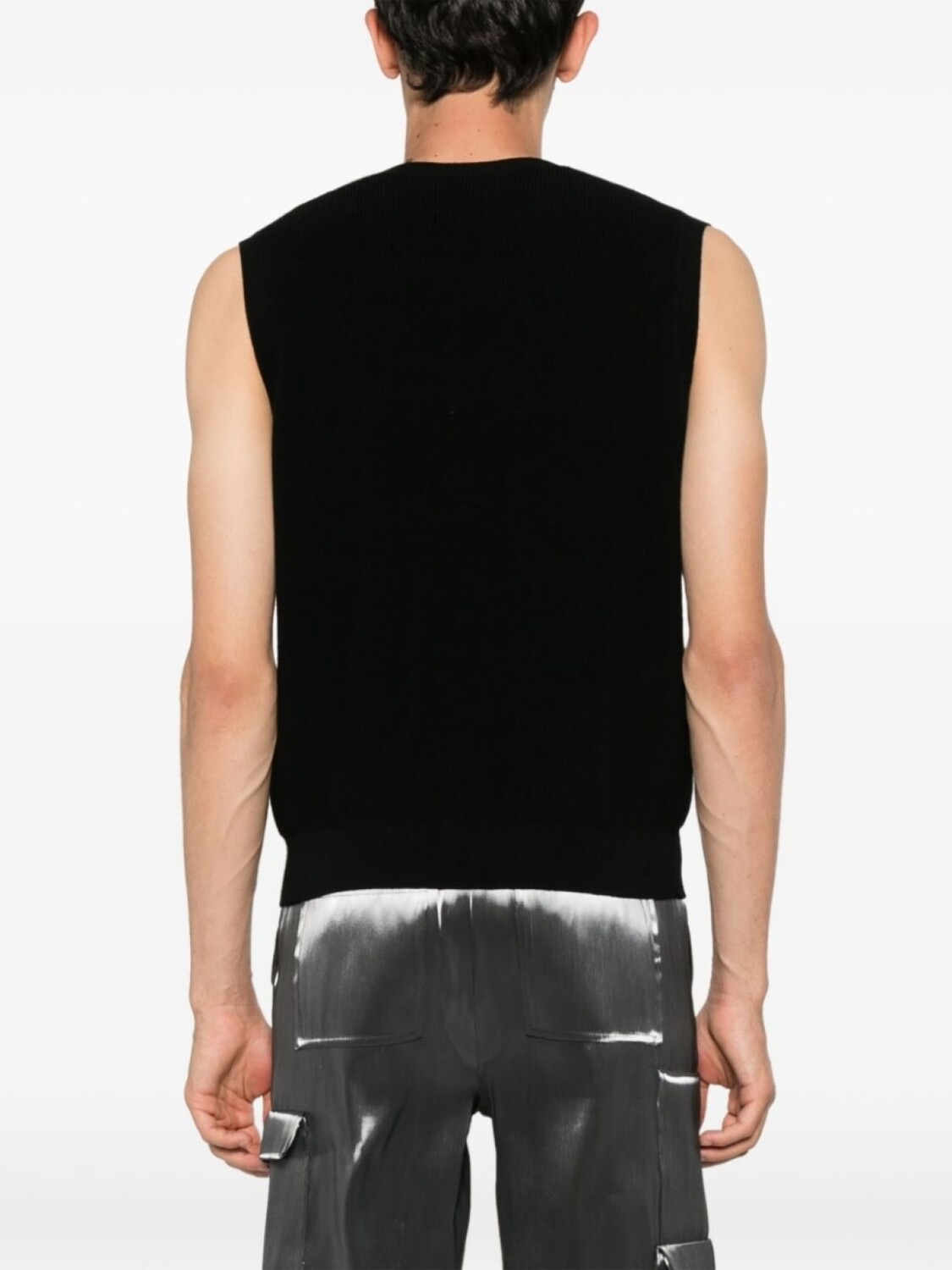 Черный, шерсть мериноса, вязаный дизайн, отделка в рубчик, круглый вырез, без рукавов, треугольные вырезы спереди, серебристая фурнитура, подол в рубчик, Это унисекс-модель. Обратите внимание, что для нее используется мужская размерная сетка.