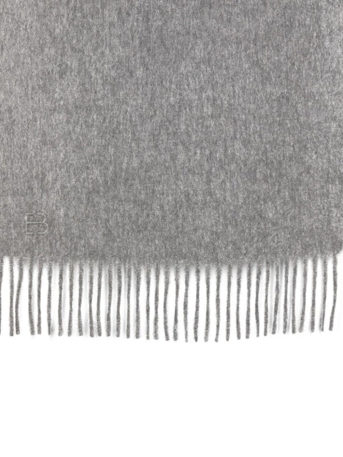 Серый, кашемир, матовый эффект, прямоугольная форма, вышитый логотип EB, края с бахромой, модель в несколько оборотов