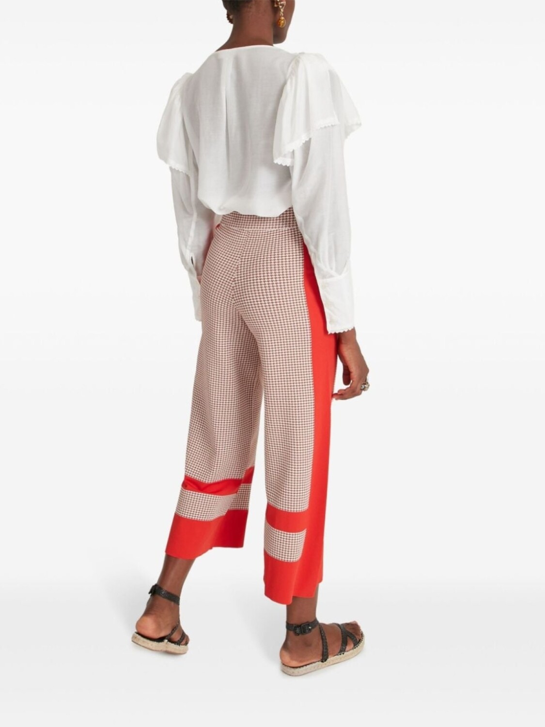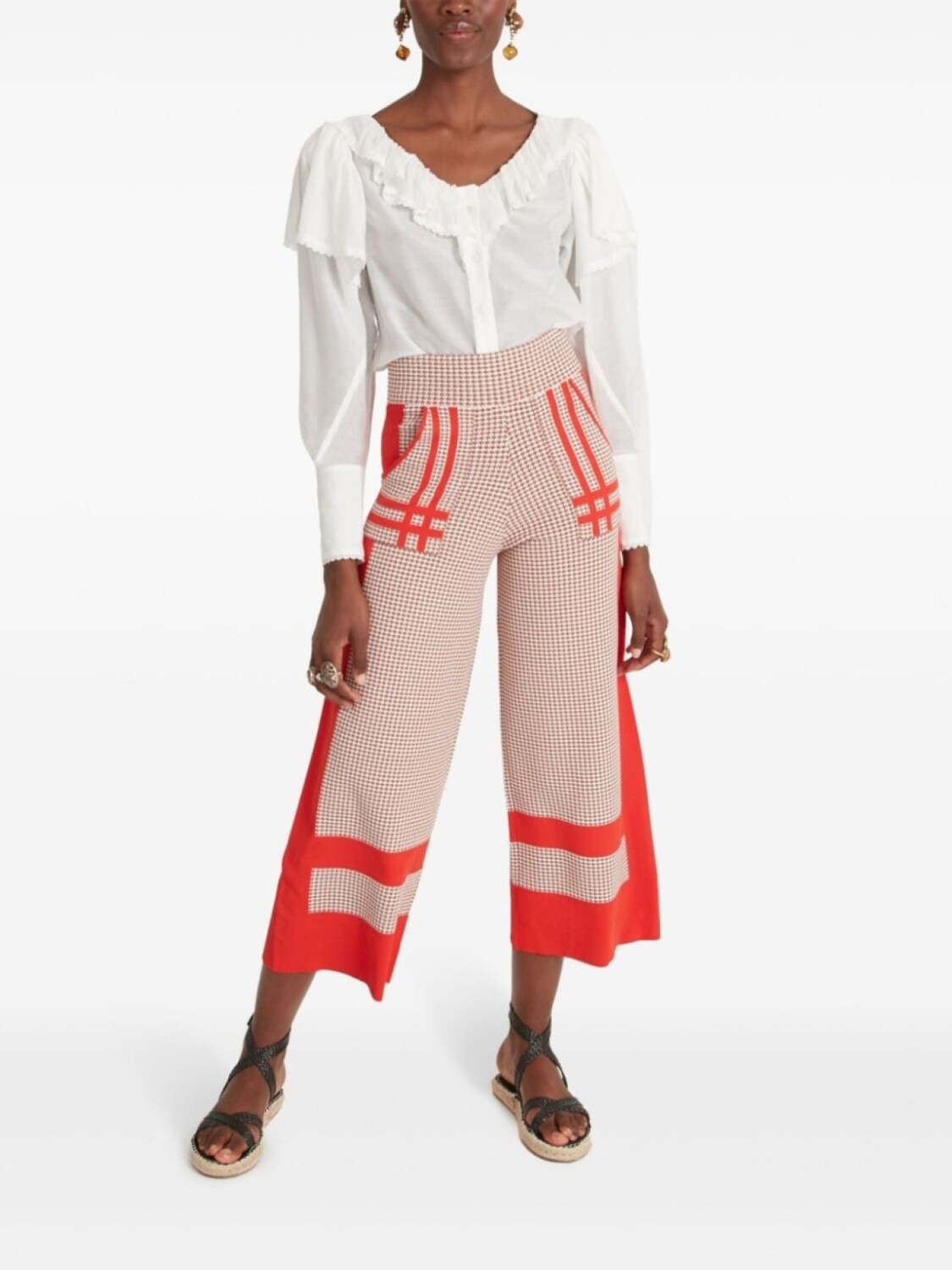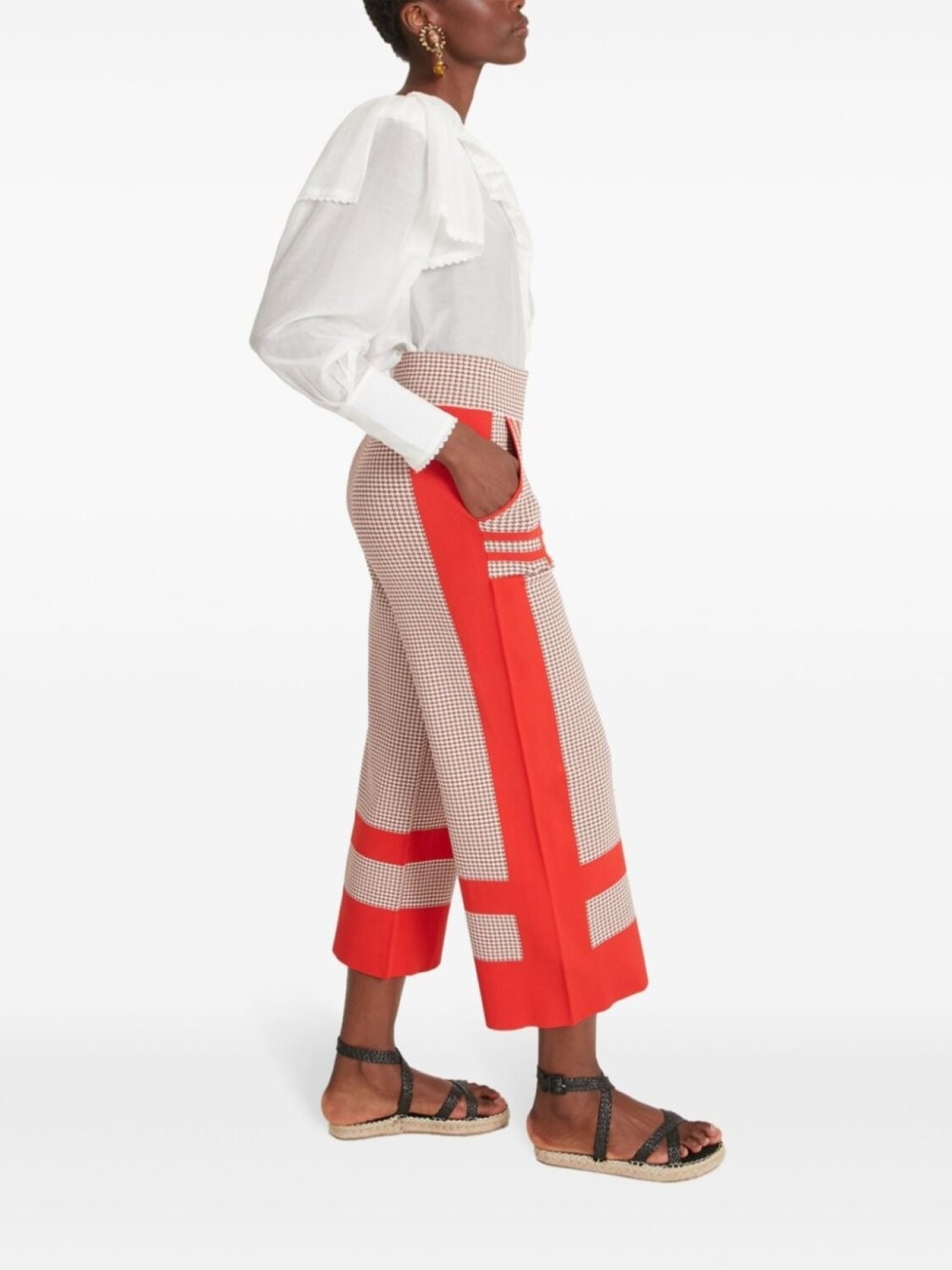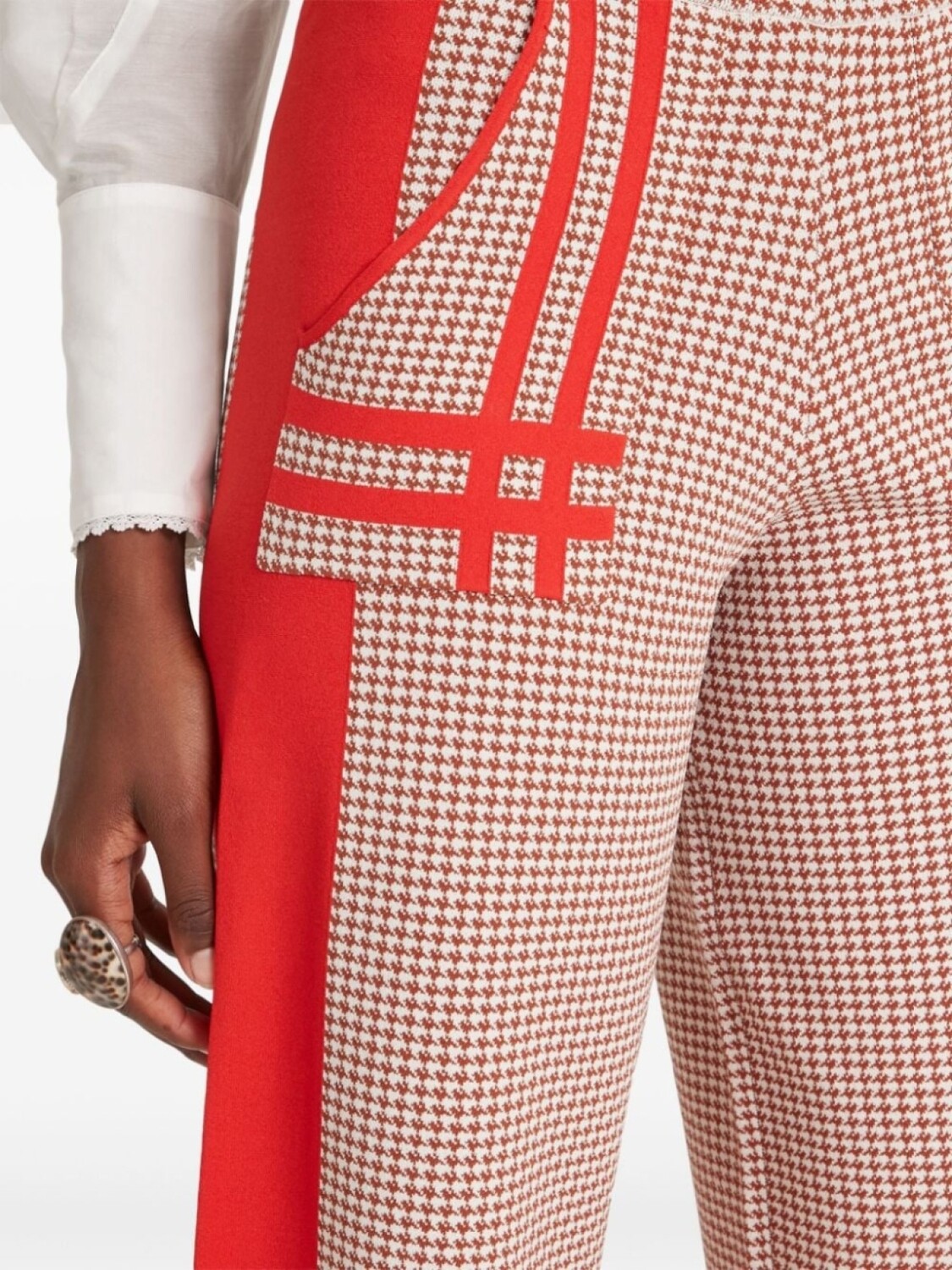 Красно-бежевый трикотаж, узор «гусиная лапка», цветные вставки, панельный дизайн, модель без застежек, эластичный пояс, высокая талия, два накладных кармана спереди, прямые штанины, укороченные, до середины икры