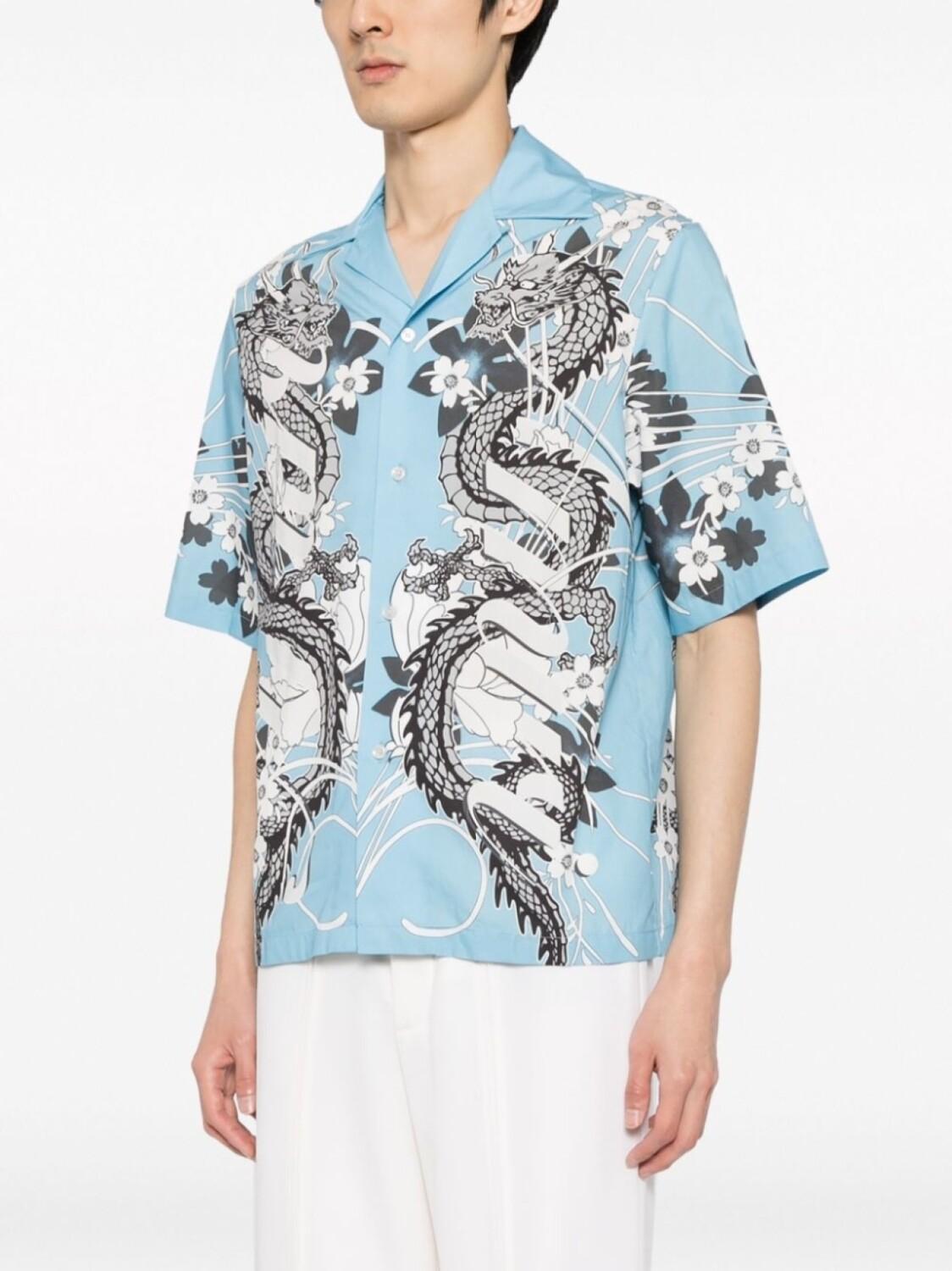Голубой, хлопок, сплошной графичный принт, плоский заостренный воротник, застежка на пуговицах спереди, короткие рукава, прямой подол