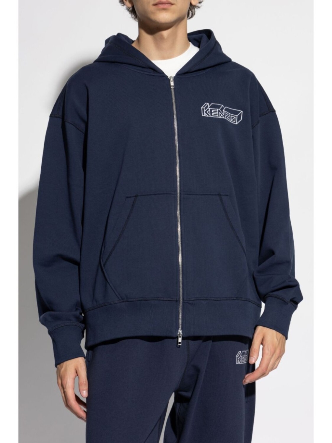Темно-синий хлопок, логотип с принтом на груди, классический капюшон, спущенное плечо, длинные рукава, двухсторонняя застежка-молния спереди, два боковых кармана-кенгуру, прямой подол