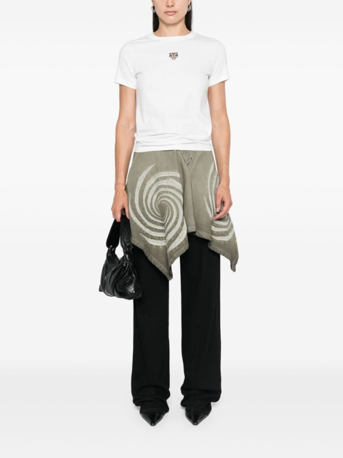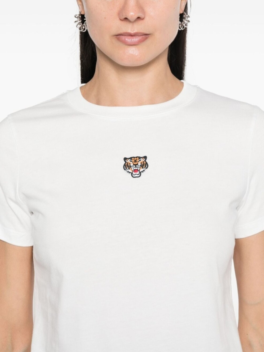 Текстура из белого хлопкового трикотажа, круглый вырез горловины, короткие рукава, вышивка Lucky Tiger спереди, прямой подол
