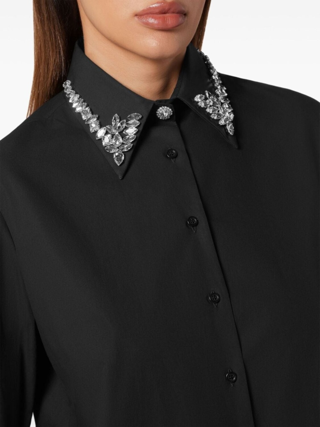 Черный хлопковый поплин текстура украшение из кристаллов прямой воротник застежка на пуговицы спереди длинные рукава манжеты на пуговицах прямой подол