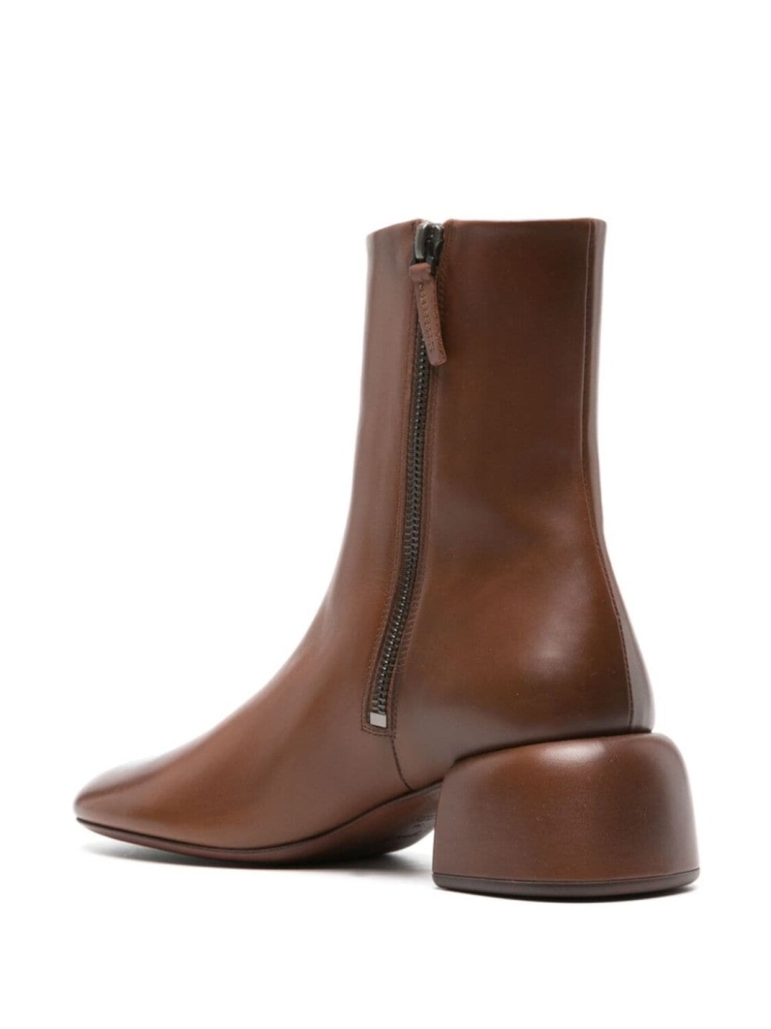 Бежево-коричневый, телячья кожа, гладкая текстура кожи, кожаная стелька с логотипом, закругленный носок, короткая застежка на молнии сбоку, высота по щиколотку, низкий блочный каблук и резиновая подошва.
