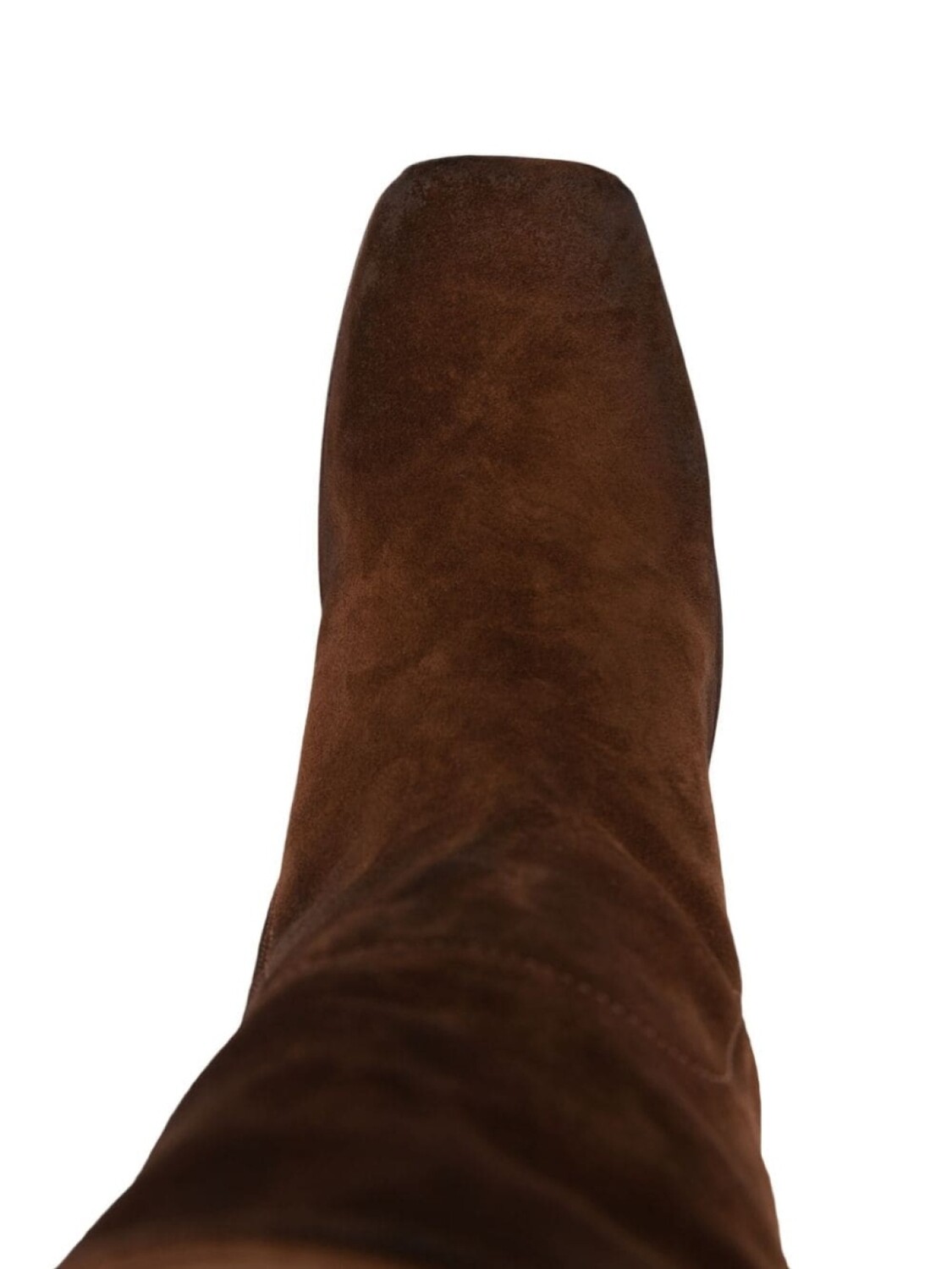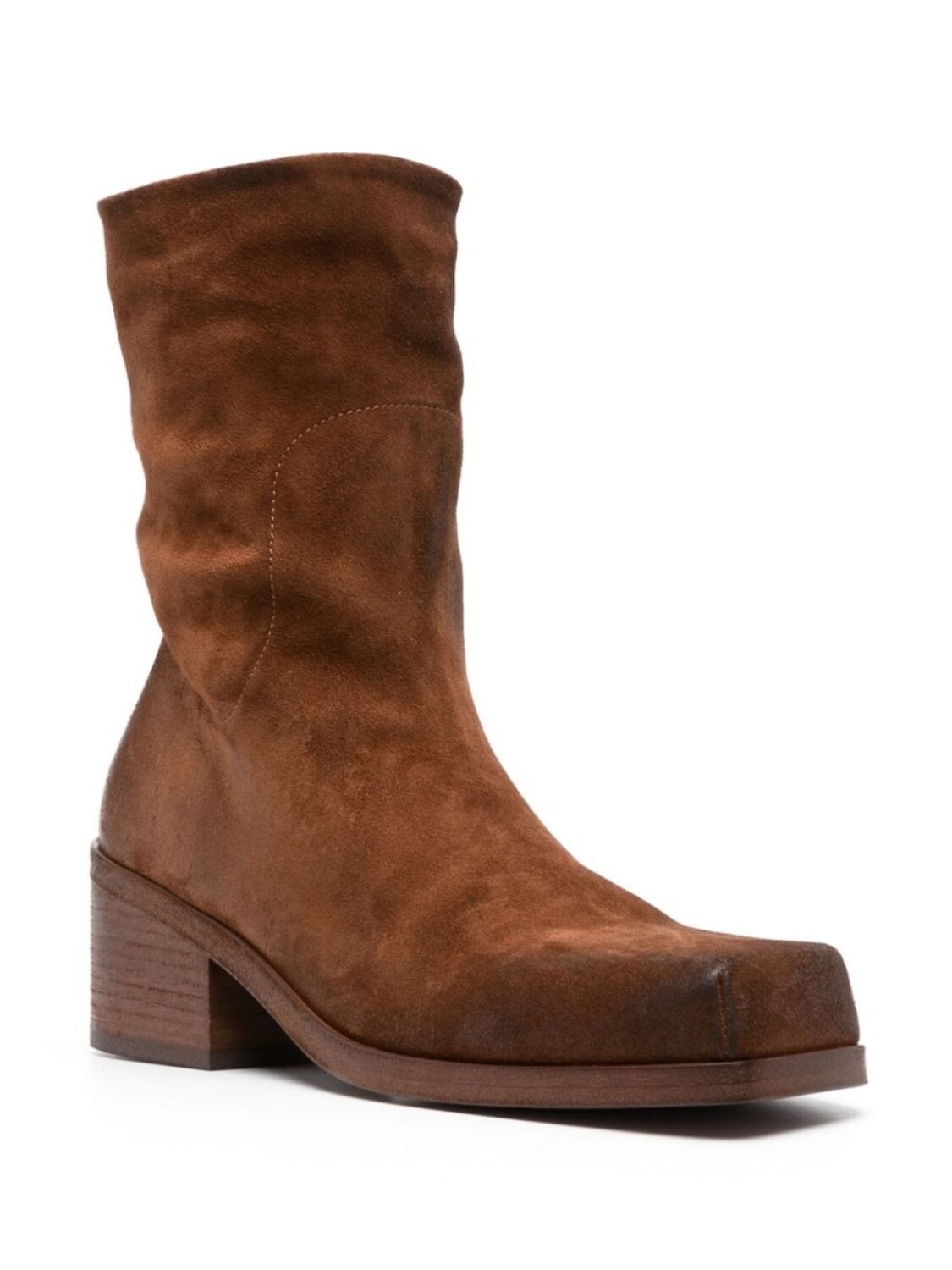 Замша из телячьей кожи, строчка в тон, квадратный носок, застежка на молнии сбоку, кожаная стелька с логотипом, блочный каблук и резиновая подошва.