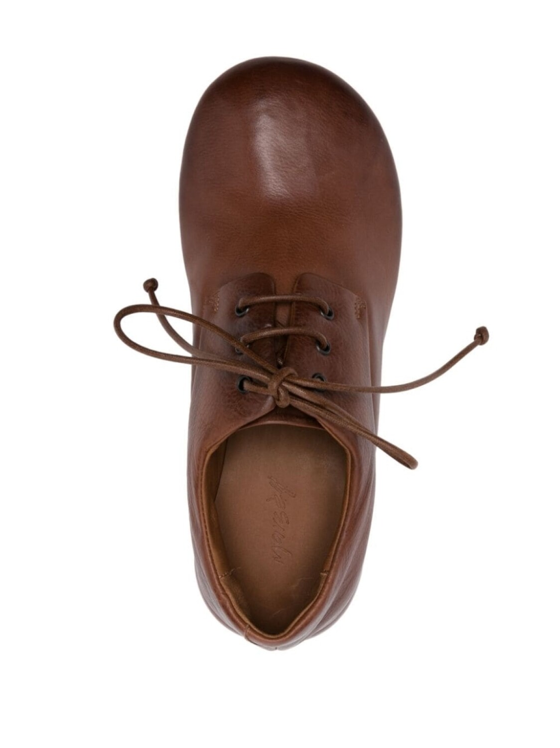 Коньячный коричневый, телячья кожа, зернистая текстура, шнуровка спереди, кожаная стелька с логотипом, блочный каблук средней высоты и закругленный носок.