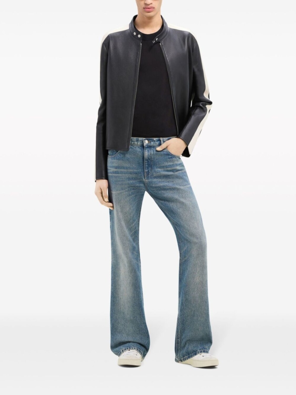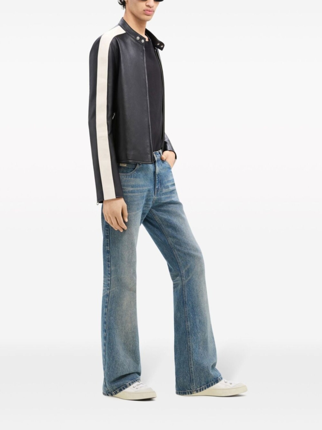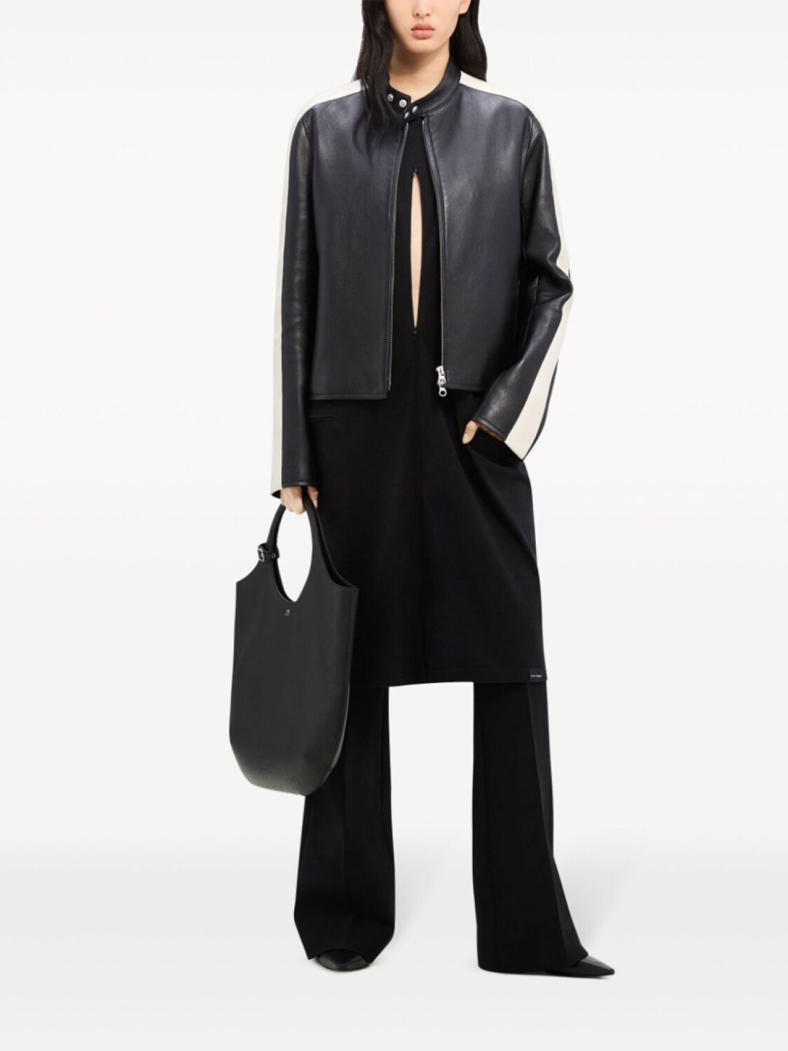 Черный/белый, овечья кожа, гладкая текстура кожи, полоски сбоку, застежка на шее, двусторонняя молния спереди, длинные рукава с манжетами на молнии, два кармана на молнии по бокам, прямой подол