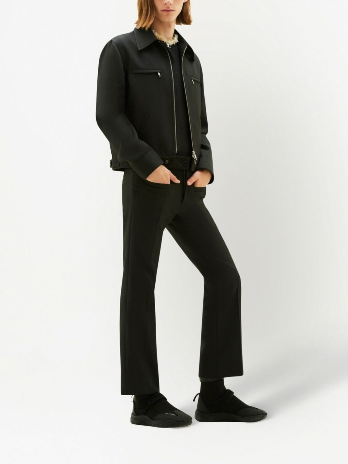 Черный, классический воротник, длинные рукава, застежка на молнии спереди, манжеты на пуговицах, два нагрудных кармана на молнии, два прорезных кармана по бокам и прямой подол.