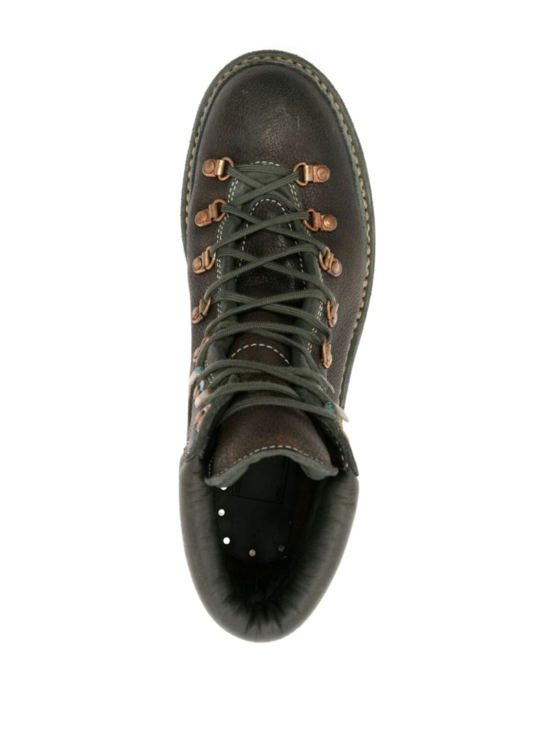 Коричневый, телячья кожа, зернистая текстура, уплотненная щиколотка, длина по щиколотку, D-образная фурнитура, шнуровка спереди, закругленный носок, кожаная стелька с логотипом, низкий наборный каблук, подошва Vibram