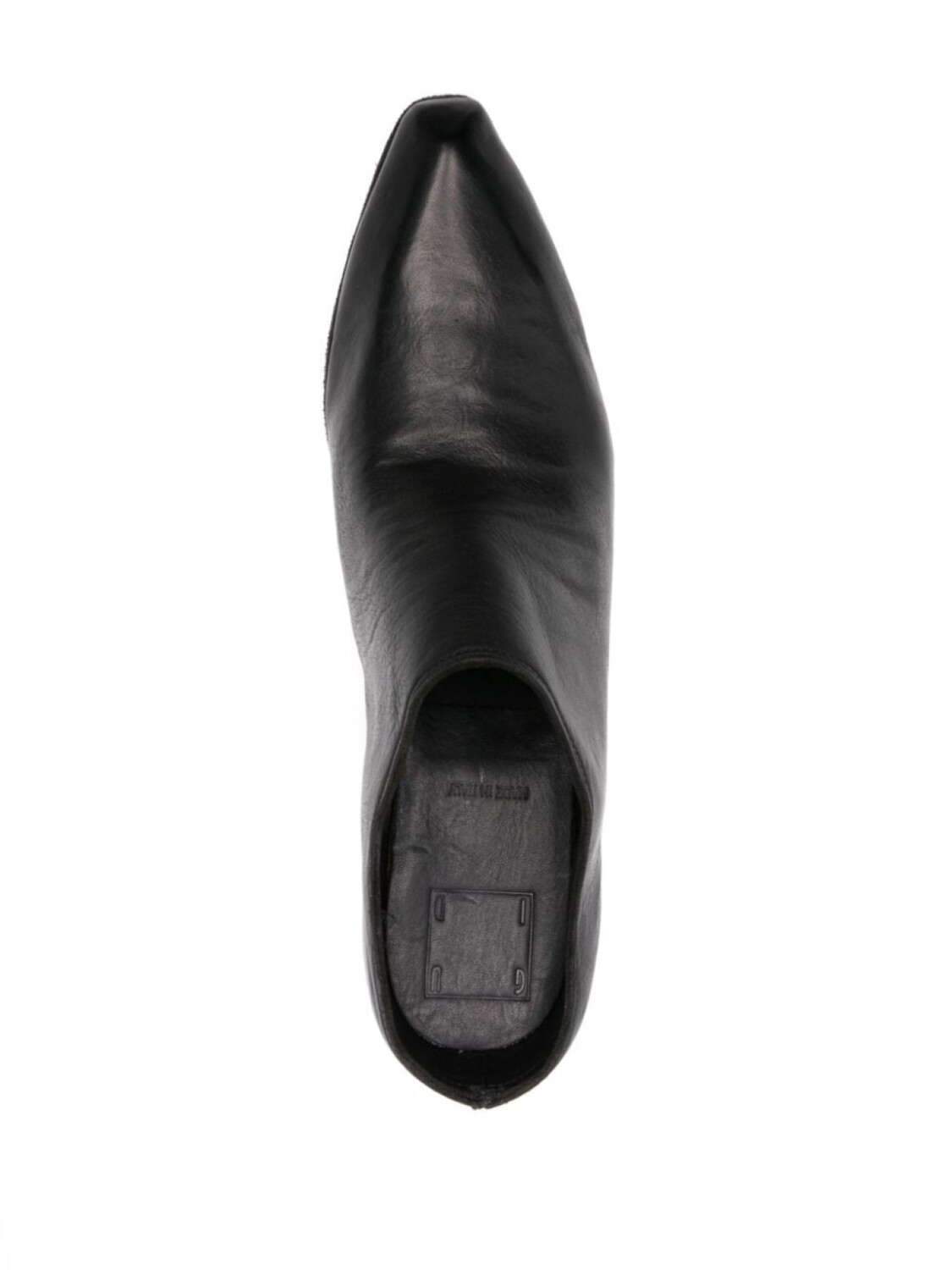 Черная телячья кожа, острый носок, открытая задняя часть, фирменная кожаная стелька, стиль «липучка», средний каблук