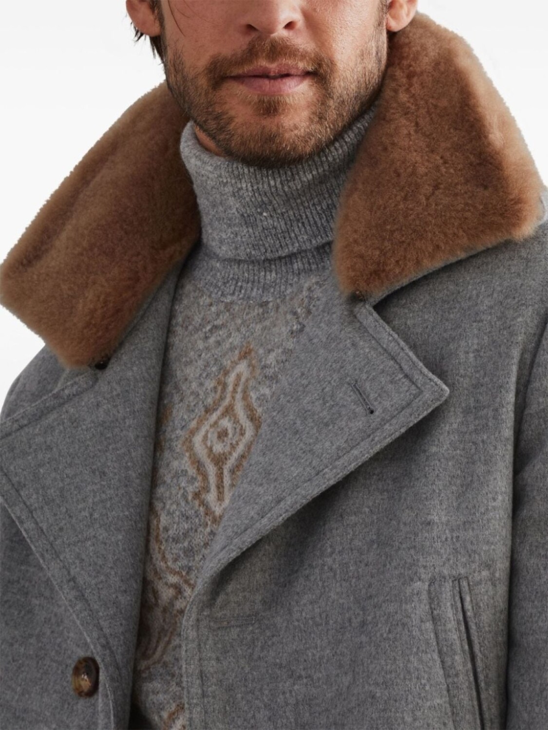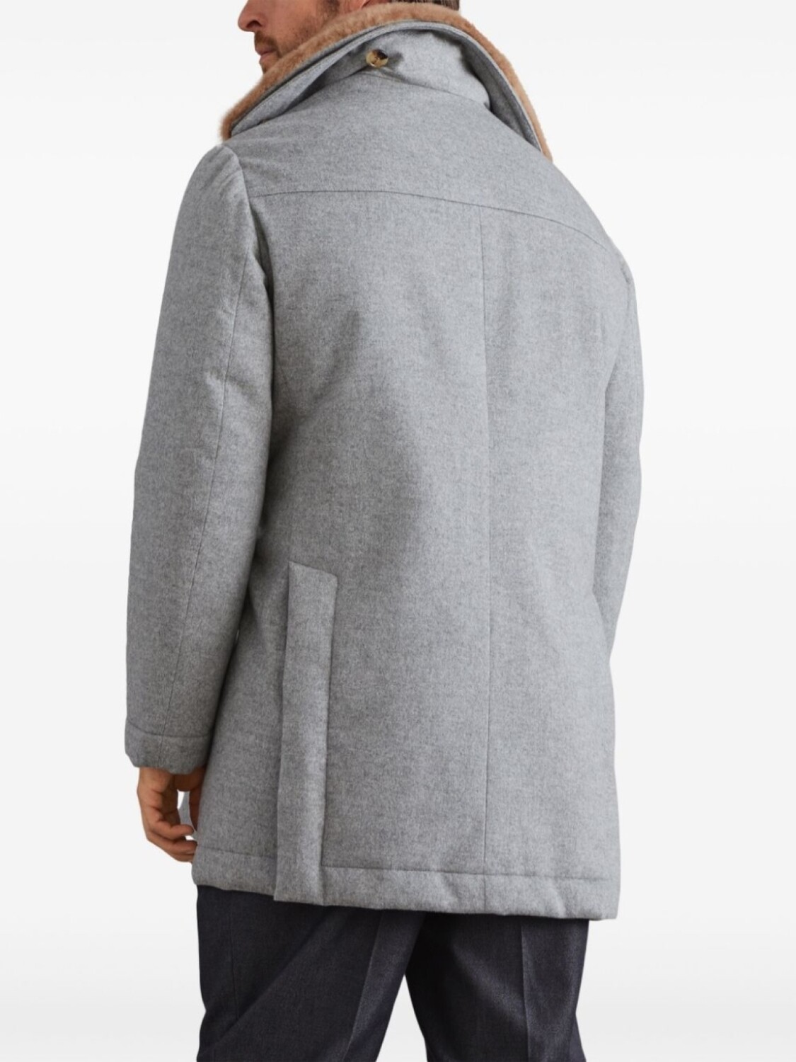 Светло-серый, кашемир, эффект меланж, воротник из искусственного меха, длинные рукава, нагрудные карманы, два передних кармана с клапанами, две боковые шлицы сзади, прямой подол, застежка на пуговицах спереди