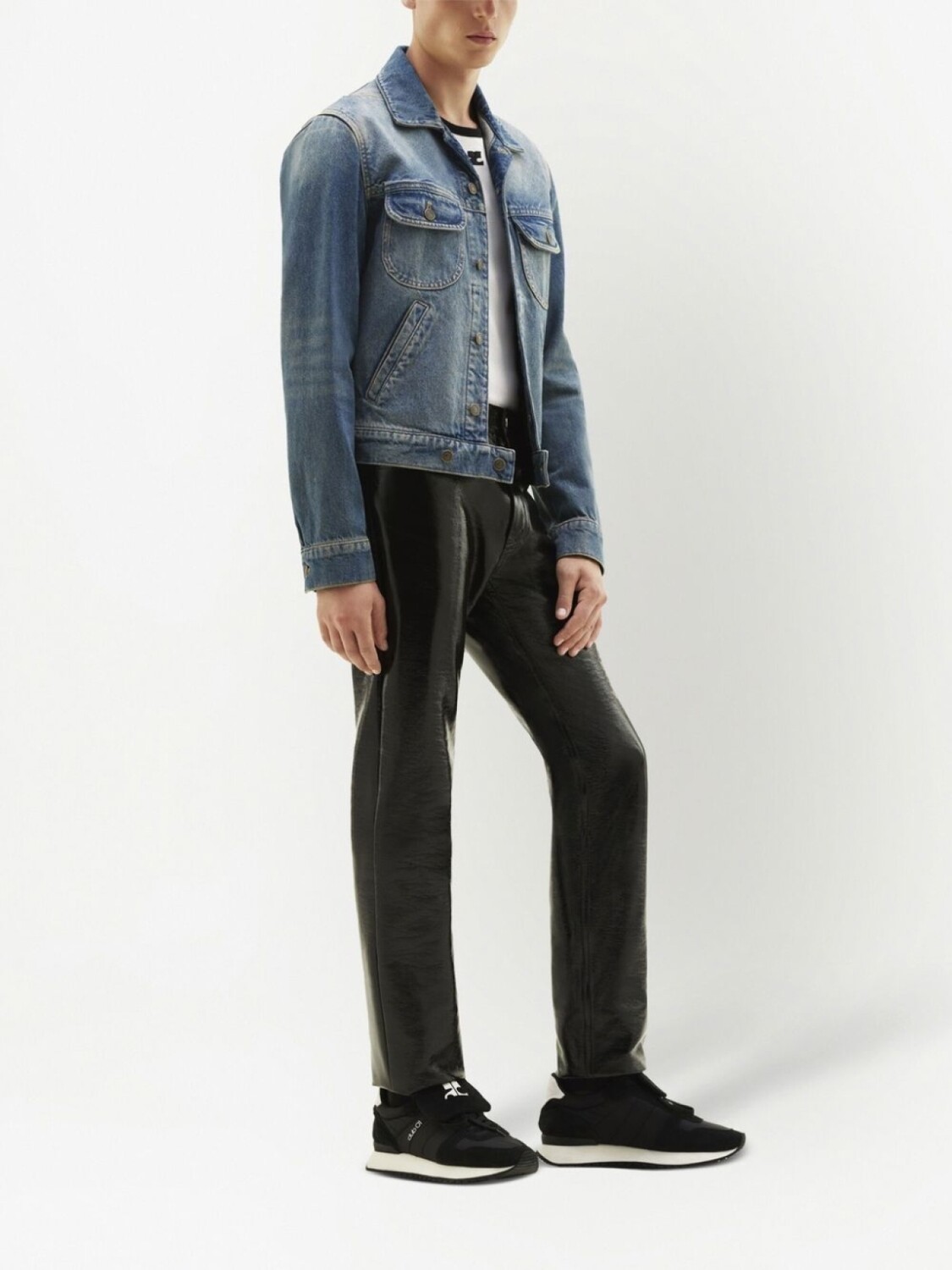 Темно-синий, эластичный хлопок, застежка на молнии и пуговице спереди, петли для ремня, прямой крой и пять карманов.