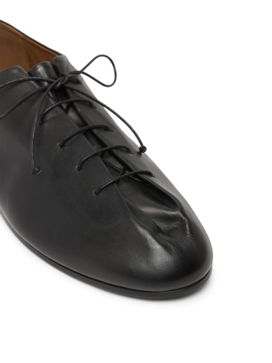 Черный, телячья кожа, гладкая текстура кожи, декоративные складки, шнуровка, закругленный носок, кожаная стелька с логотипом, плоская подошва