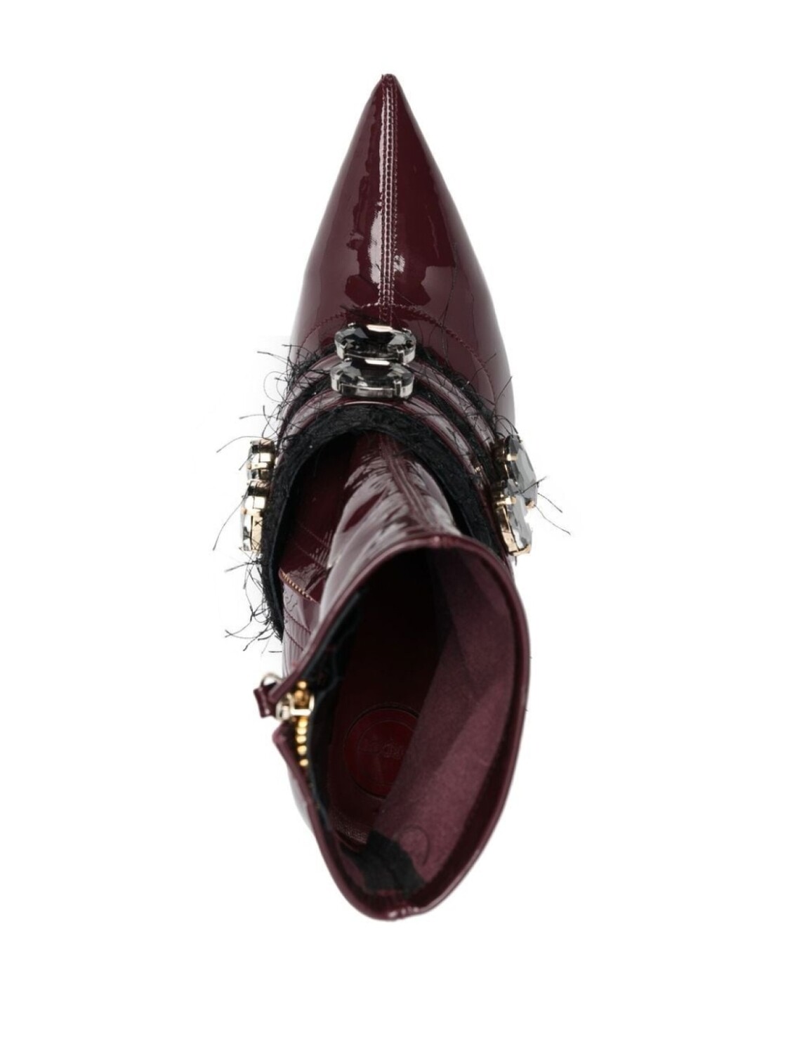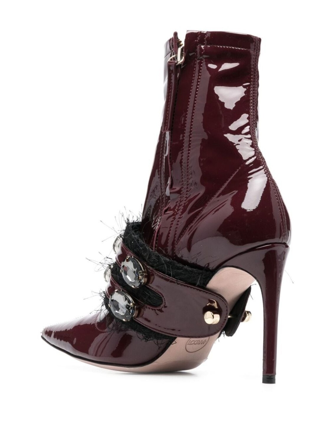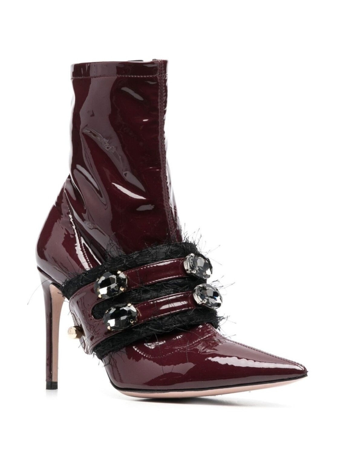 Бордовый, черный, телячья кожа, лакированная отделка, декор из кристаллов, заостренный носок, высота по щиколотку, застежка на молнии сбоку и каблук на высокой шпильке.