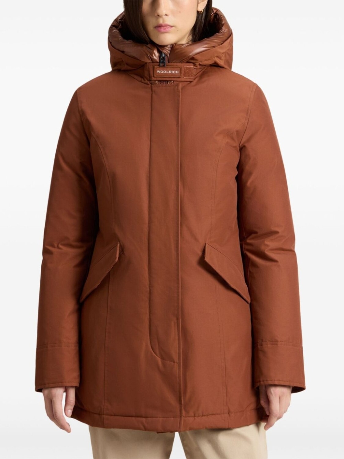 Оранжевый, смесовый хлопок, утиный пух, водонепроницаемая модель, потайная молния спереди, потайная пуговичная застежка спереди, классический капюшон, длинные рукава, два кармана с клапанами по бокам, прямой подол, внутренняя вставка с логотипом