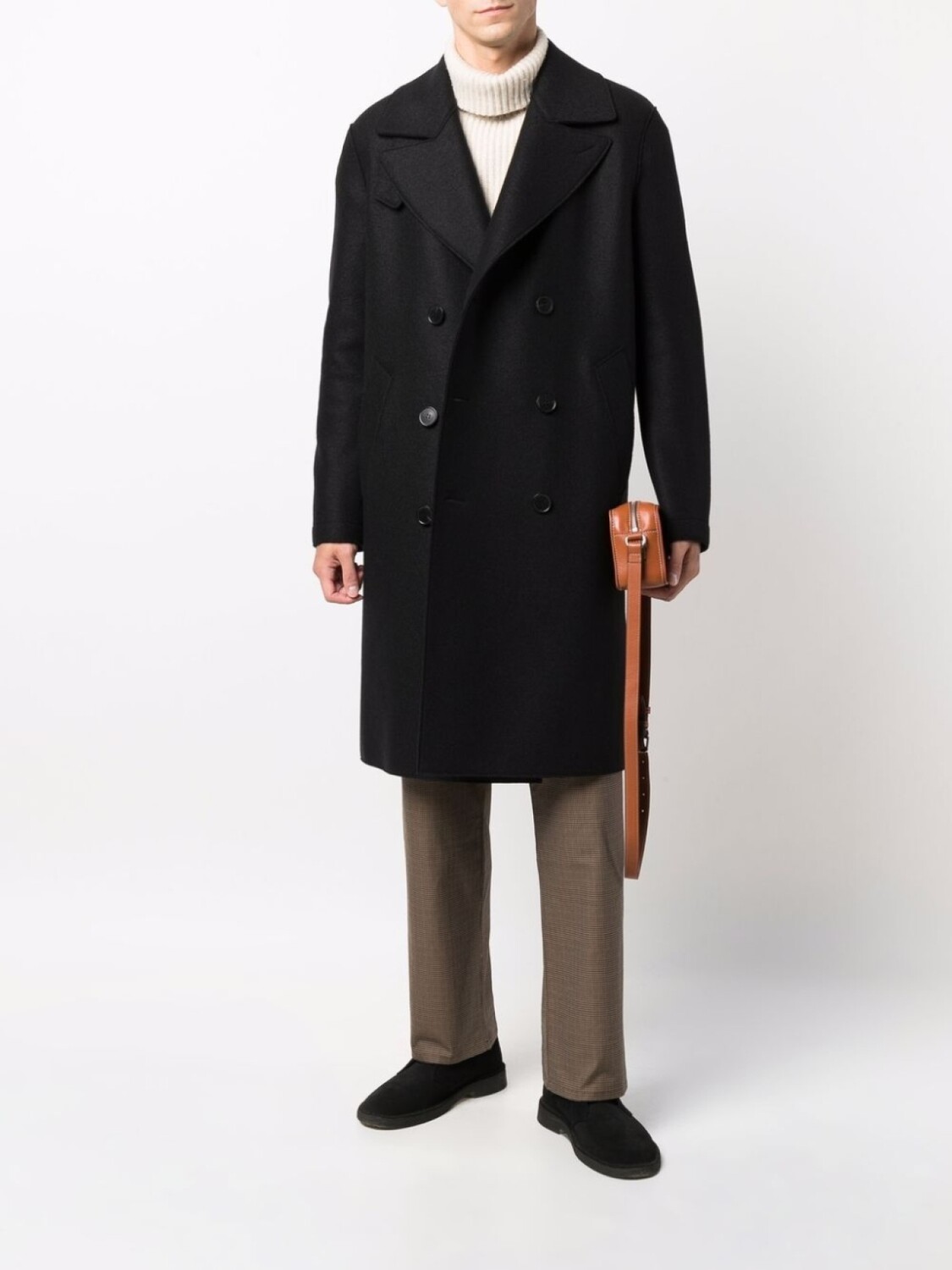 Узкий крой, двубортная застежка на пуговицы, классические лацканы, застежка на пуговицы, длинные рукава и длина миди. Цвет: черный. .