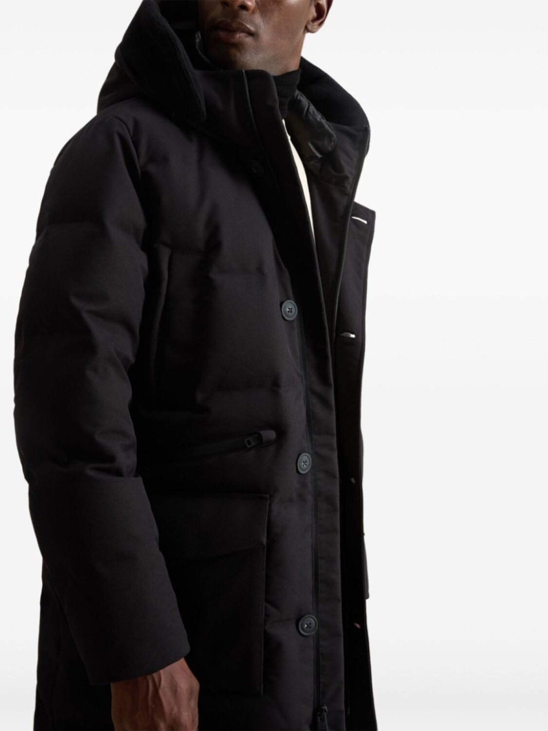 Черный, наполнитель из смеси пуха и пера, дутый материал, водонепроницаемый материал, ветронепроницаемый материал, застежка на пуговицах спереди, высокий воротник, съемный капюшон, логотип на капюшоне, длинные рукава, два нагрудных кармана с листочкой, два кармана на молнии по бокам, два кармана с клапанами по бокам, прямой подол, длина миди