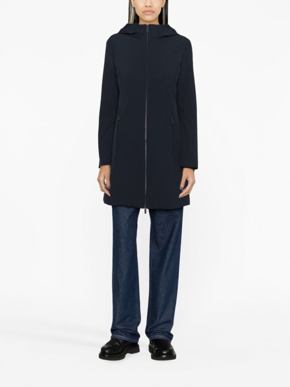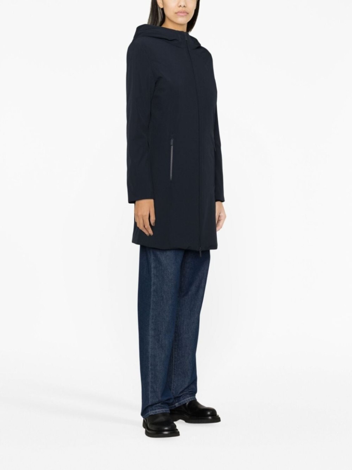 Синий, наполнитель из пуха и перьев, классический капюшон, застежка на молнии спереди, длинные рукава, передние карманы на молнии, длина миди и прямой подол.