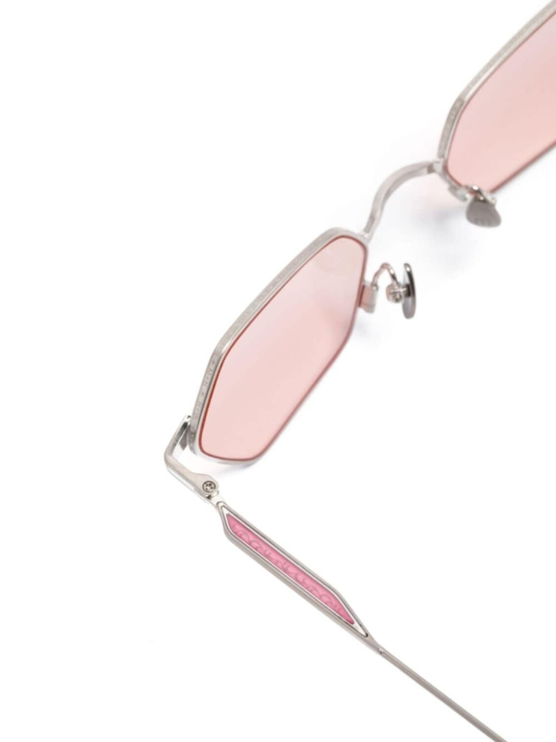 Серебристый, металл, оправа геометрической формы, розовые линзы, гравировка, носоупоры, прямые дужки и закругленный подол. Обратите внимание, что на FARFETCH продаются оправы с линзами без диоптрий. В комплект входит защитный чехол для очков.