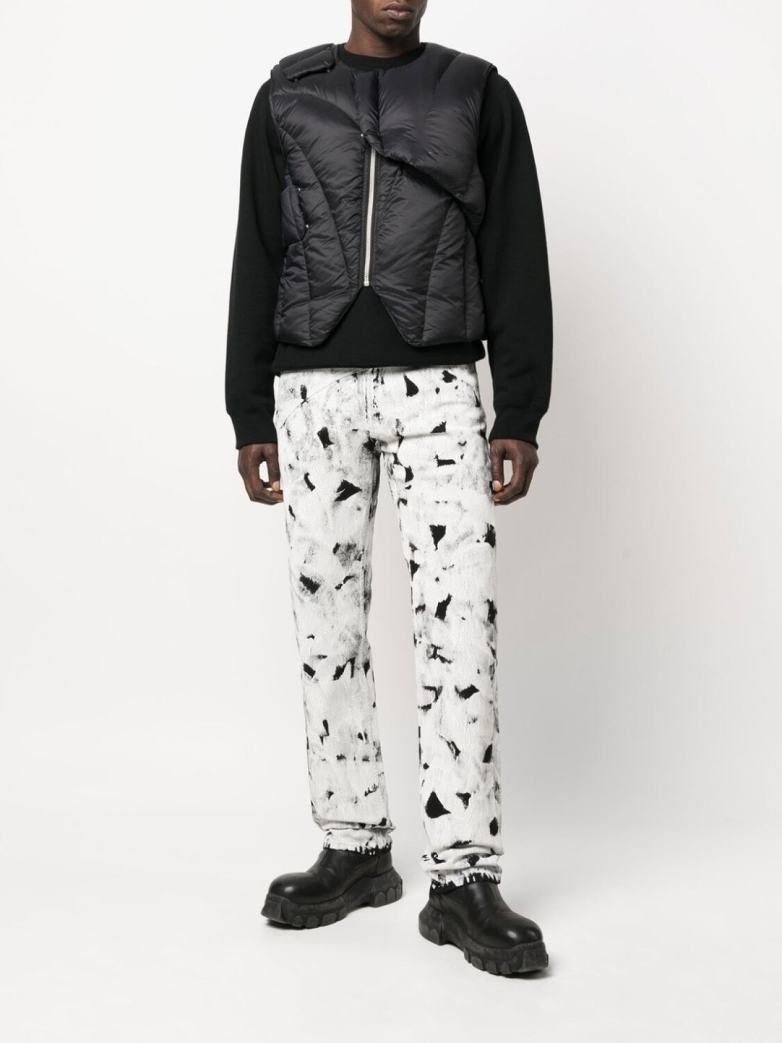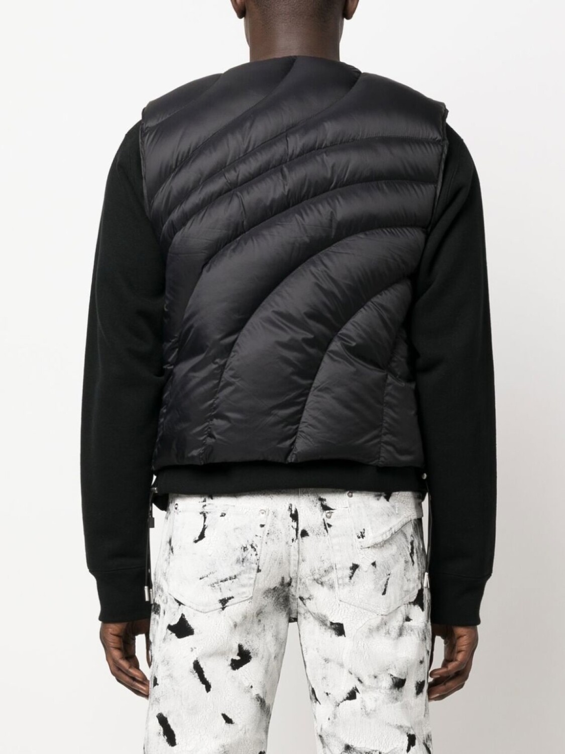 Черный, переработанный полиамид, дутый материал, принт с логотипом на груди, круглый вырез, застежка на молнии спереди и без рукавов. .