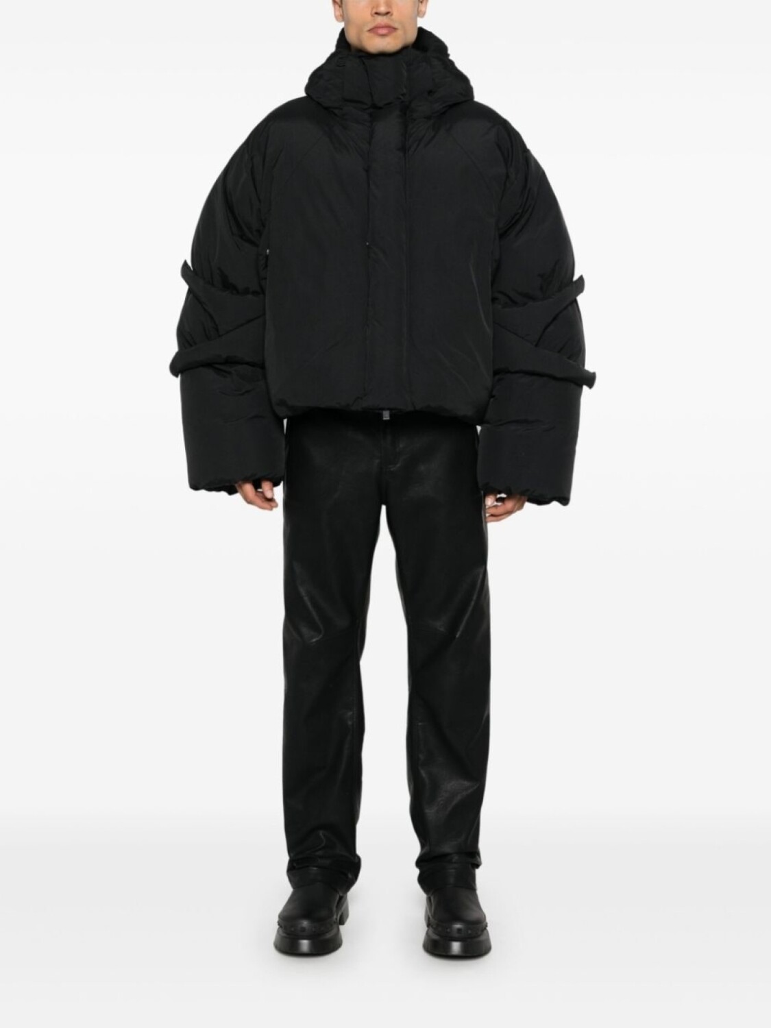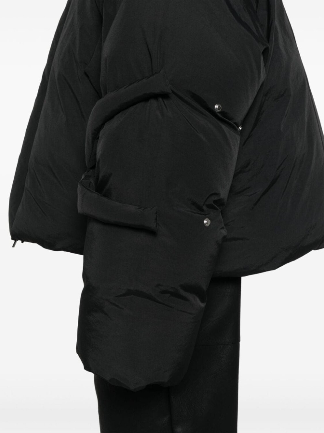 Подробнее о товаре: • черный • дутый материал • наполнитель из смеси пуха и пера • регулируемые вставки на кнопках на рукавах • затягивающийся на шнурок капюшон • воротник-труба • застежка на кнопки и молнию спереди • приспущенные плечи • длинные рукава • манжеты в рубчик • два кармана на кнопке по бокам • цельная подкладка • внутренний карман на молнии • подол с кулиской