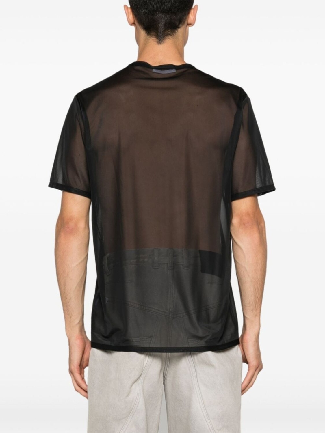 Черный, легкая ткань джерси, прозрачный дизайн, логотип-аппликация, круглый вырез, короткие рукава, прямой подол, Это унисекс-модель. Обратите внимание, что для нее используется мужская размерная сетка.