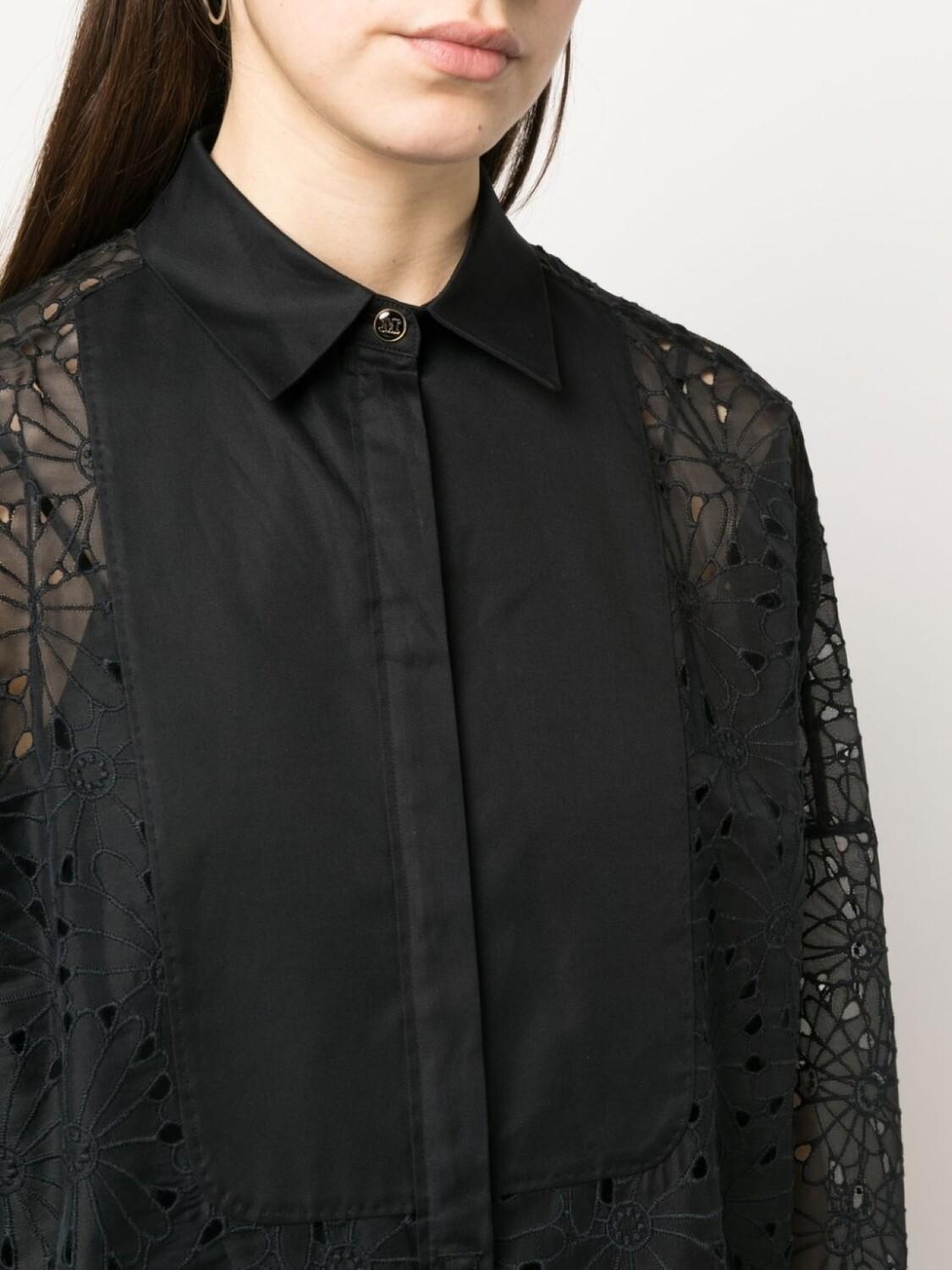 Черный, смесовый хлопок, шелк, вышивка, полупрозрачный верхний слой, плоский заостренный воротник, потайная пуговичная застежка спереди, длинные рукава, манжеты на пуговицах, прямой подол и cъемное платье-комбинация.