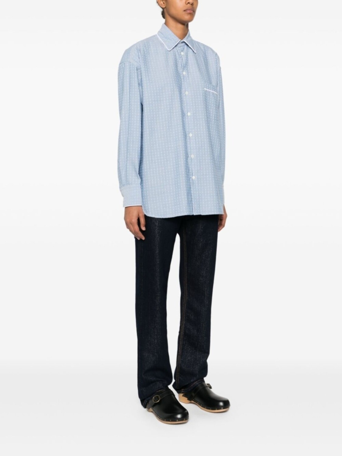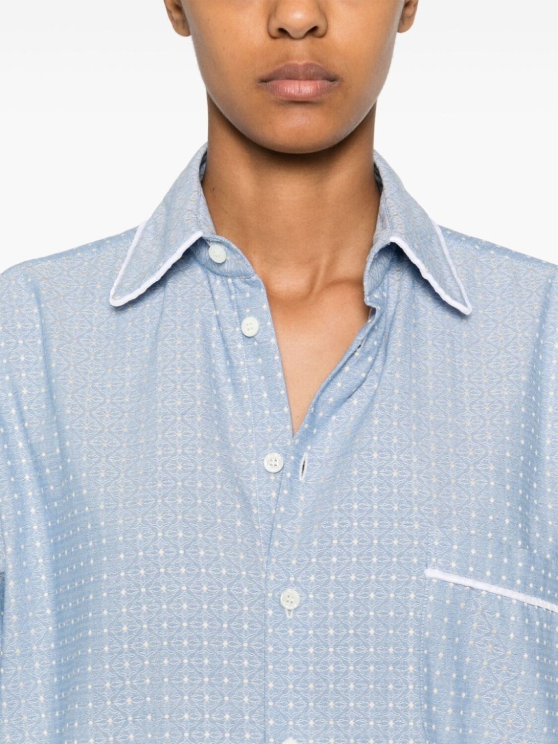 Васильковый, хлопок, жаккардовый материал с цветочным узором, застежка на пуговицах спереди, окантовка, классический воротник, длинные рукава с манжетами на пуговицах, нагрудный накладной карман, складки сзади, ластовицы на подоле, асимметричный подол