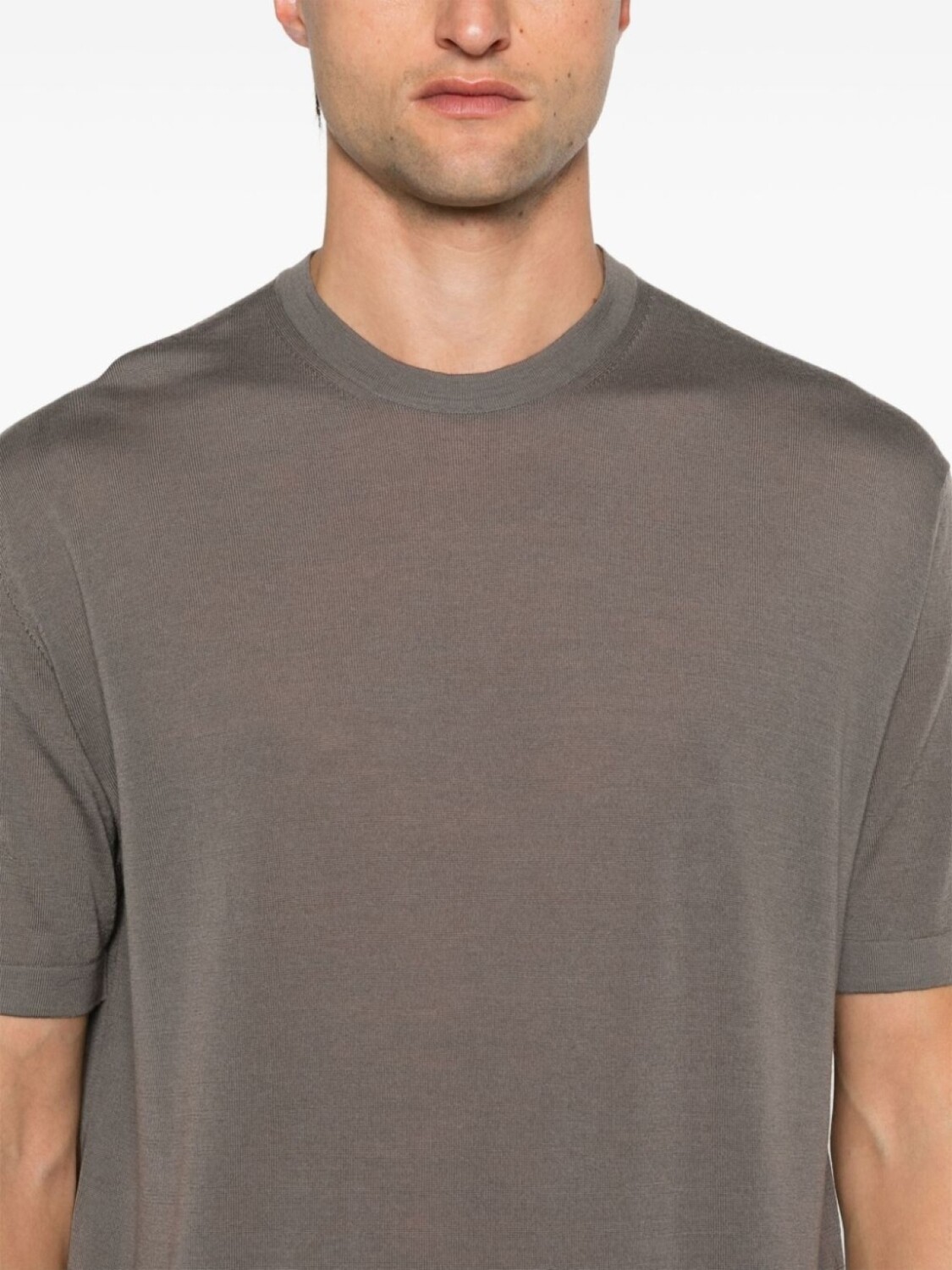 Серо-коричневая шерсть, тонкая вязка, круглый вырез, короткие рукава, прямой подол