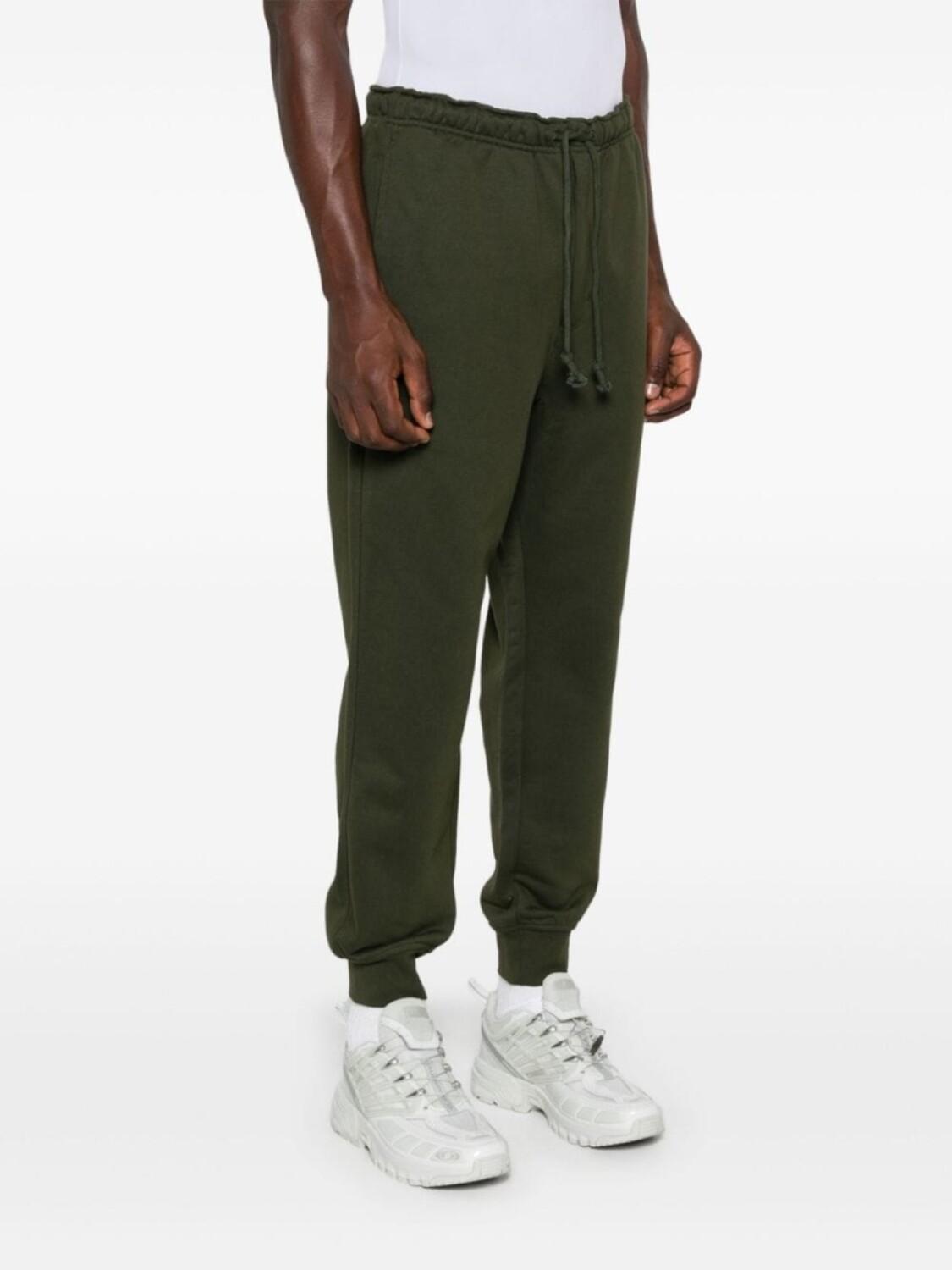 Зеленый, смесовый хлопок, ткань джерси, эластичный пояс на шнурке, два прорезных кармана сбоку, логотип спереди, задний карман с листочкой, манжеты в рубчик, зауженный крой