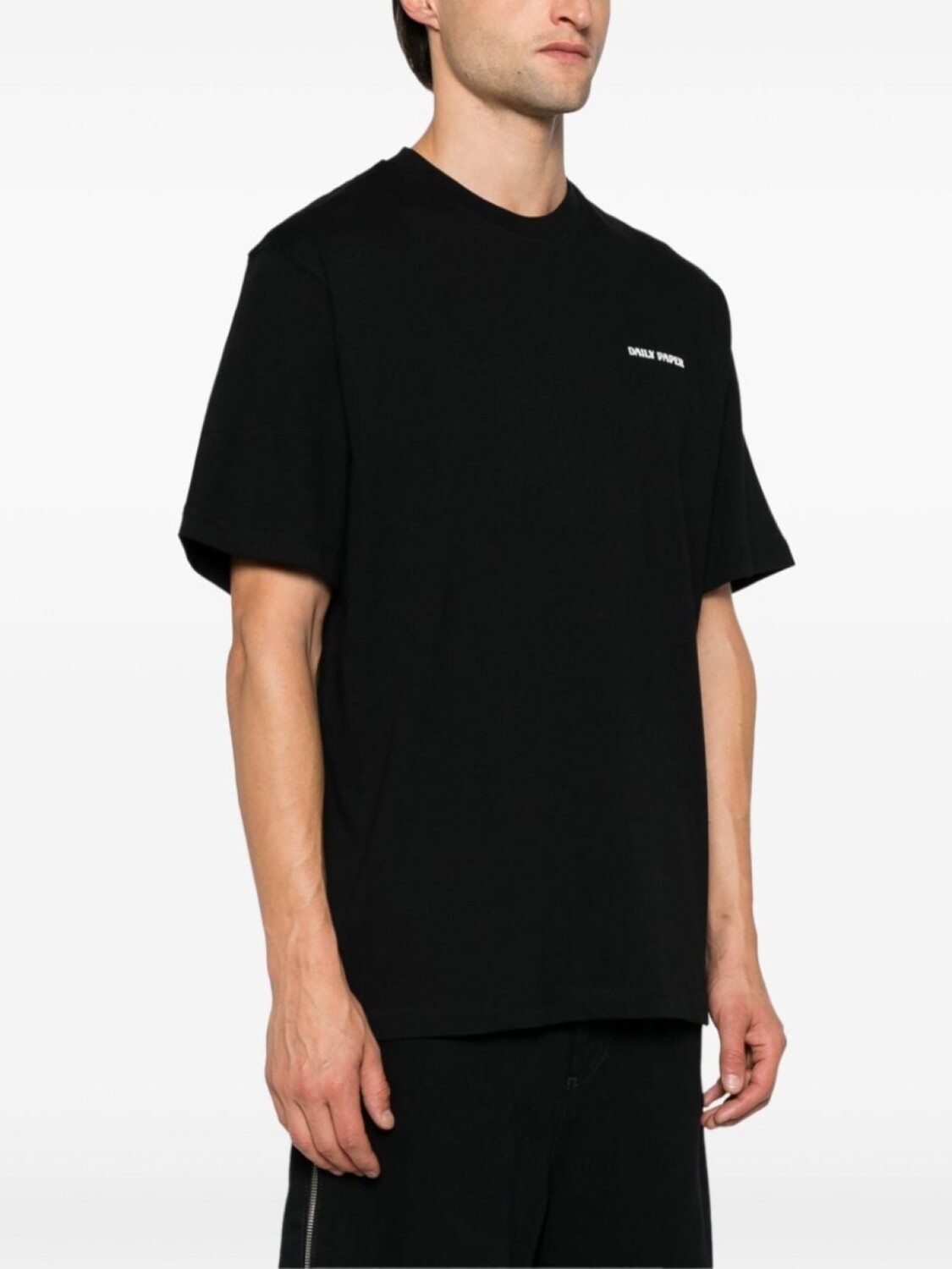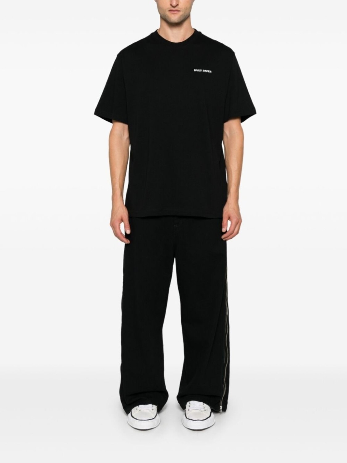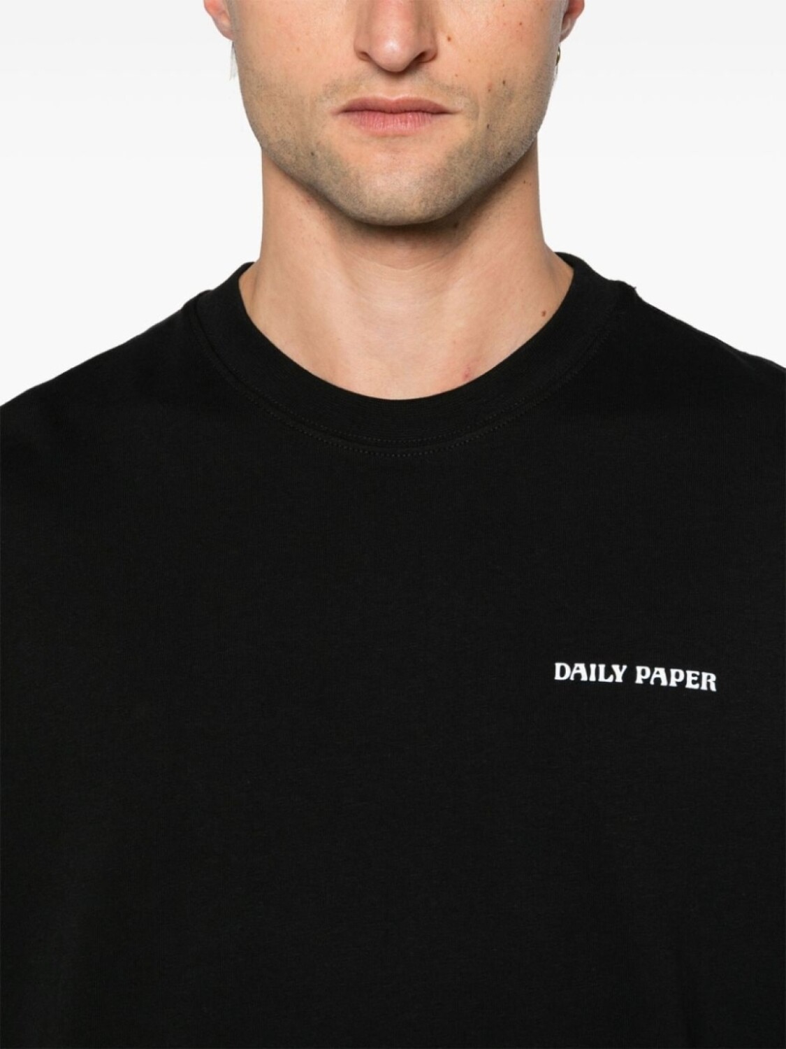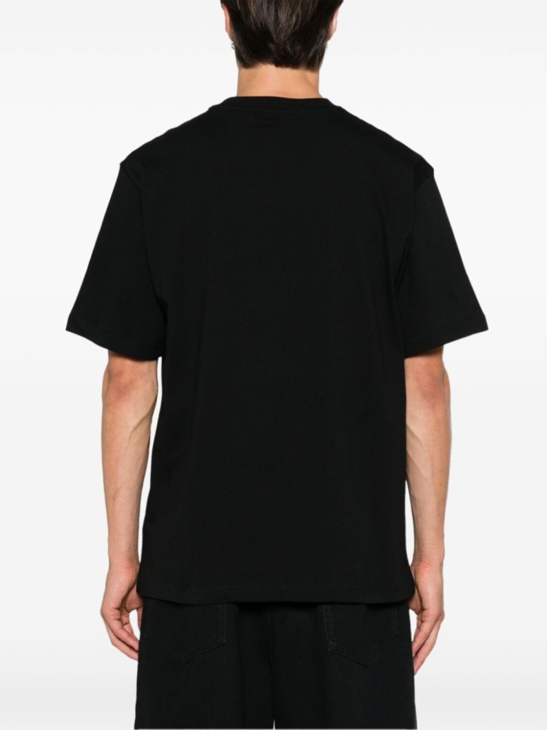 Черный хлопковый легкий трикотаж круглый вырез горловины принт с логотипом на груди короткие рукава прямой подол
