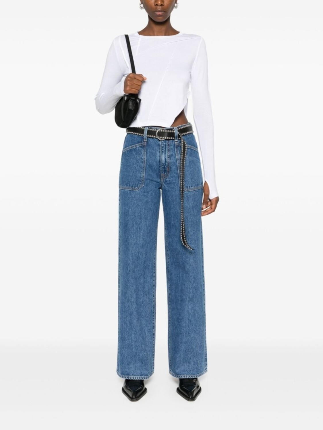 Белая хлопковая смесь, лоскутный узор, круглый вырез, длинные рукава, прорези для больших пальцев, вышитый логотип на рукаве, боковой разрез, асимметричный подол