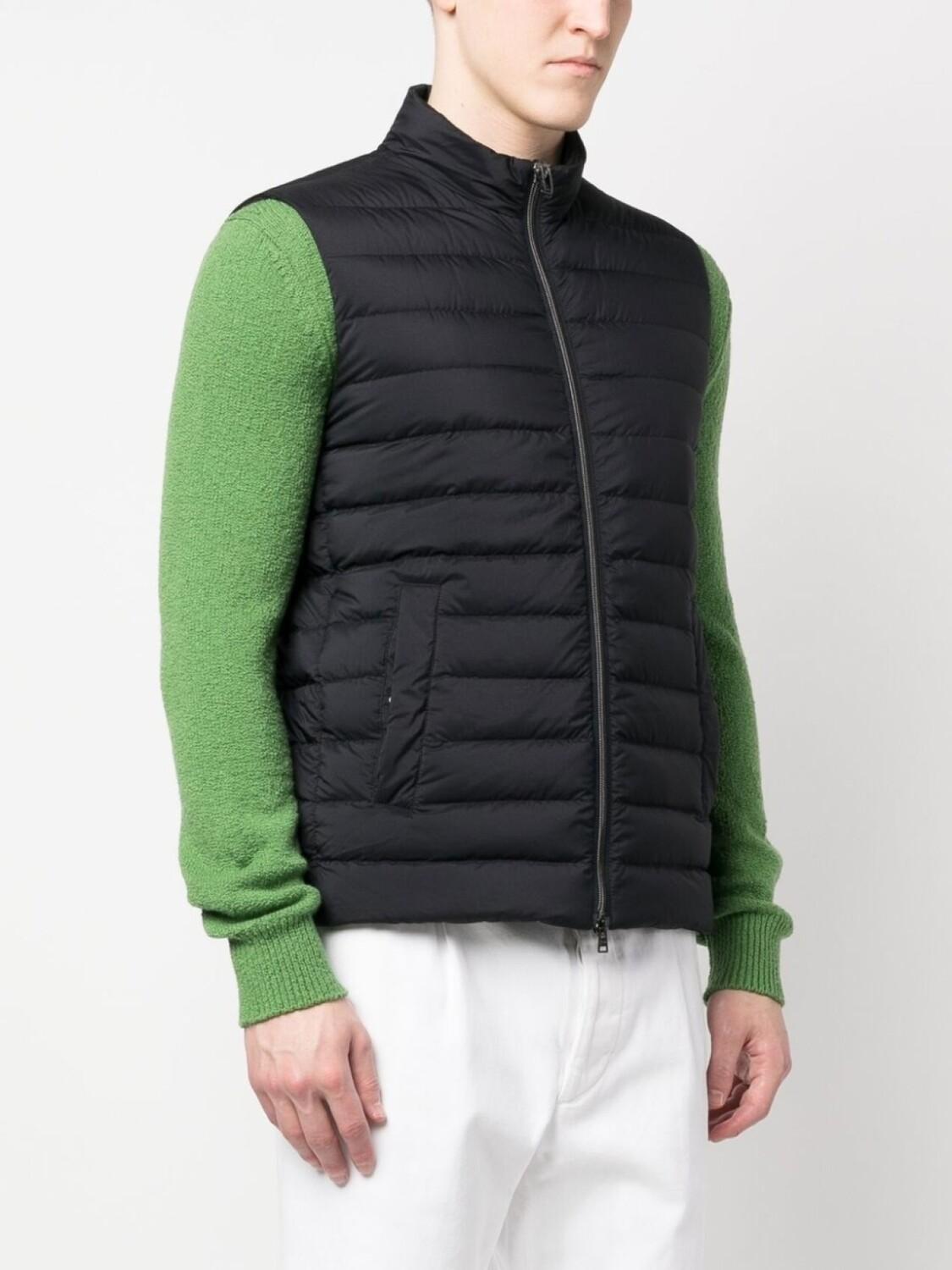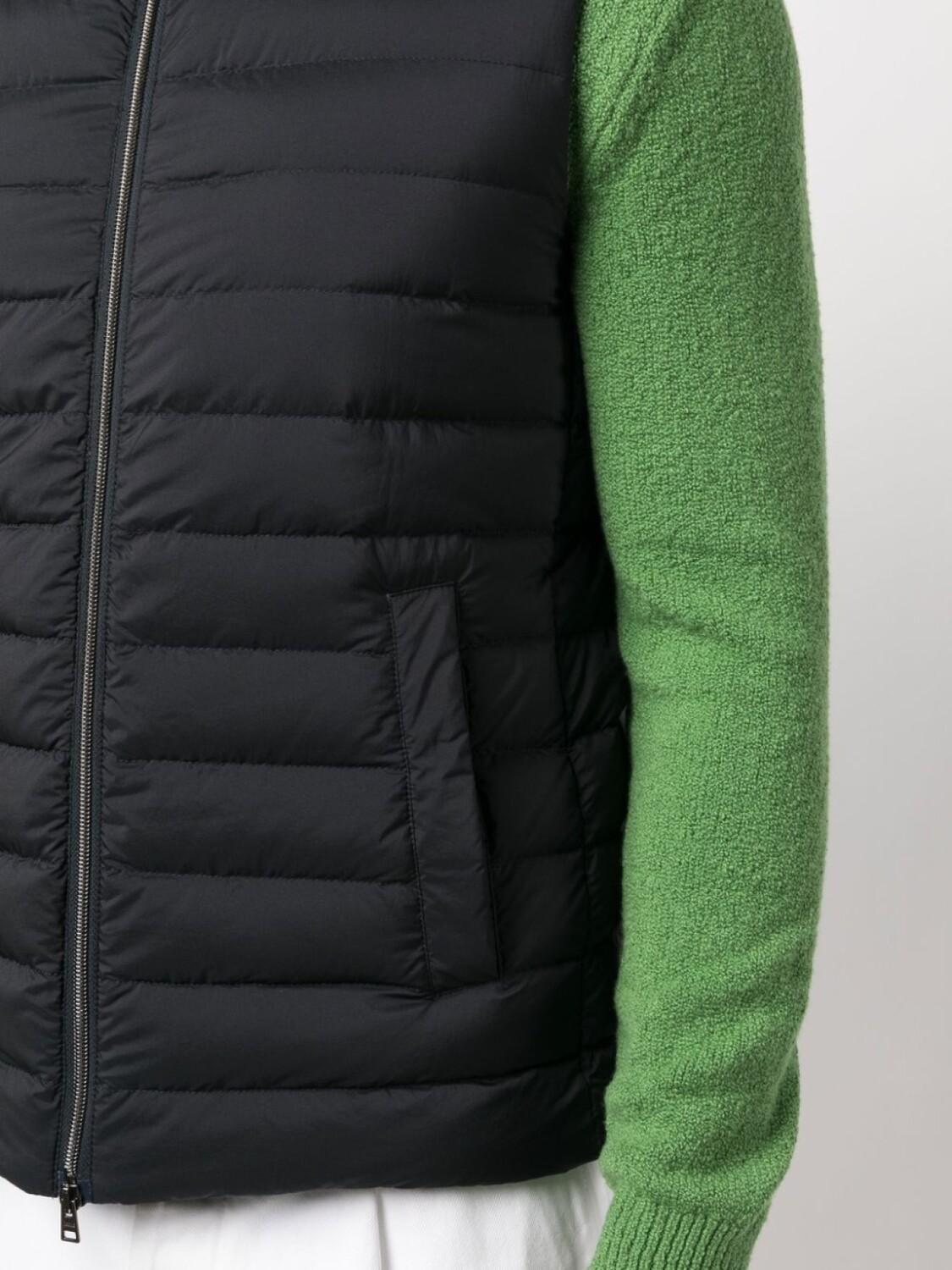 Темно-синий, наполнитель из смеси пуха и пера, дутые вставки, высокий воротник, застежка на молнии спереди, без рукавов и два прорезных кармана сбоку.