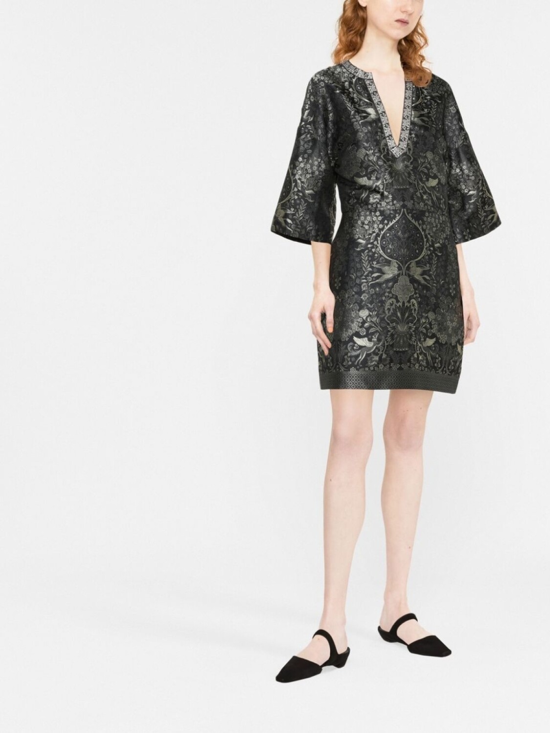 Черный, сплошная цветочная вышивка, V-образный вырез, отделка корсажной лентой, широкие рукава, рукава три четверти и длина до бедер.