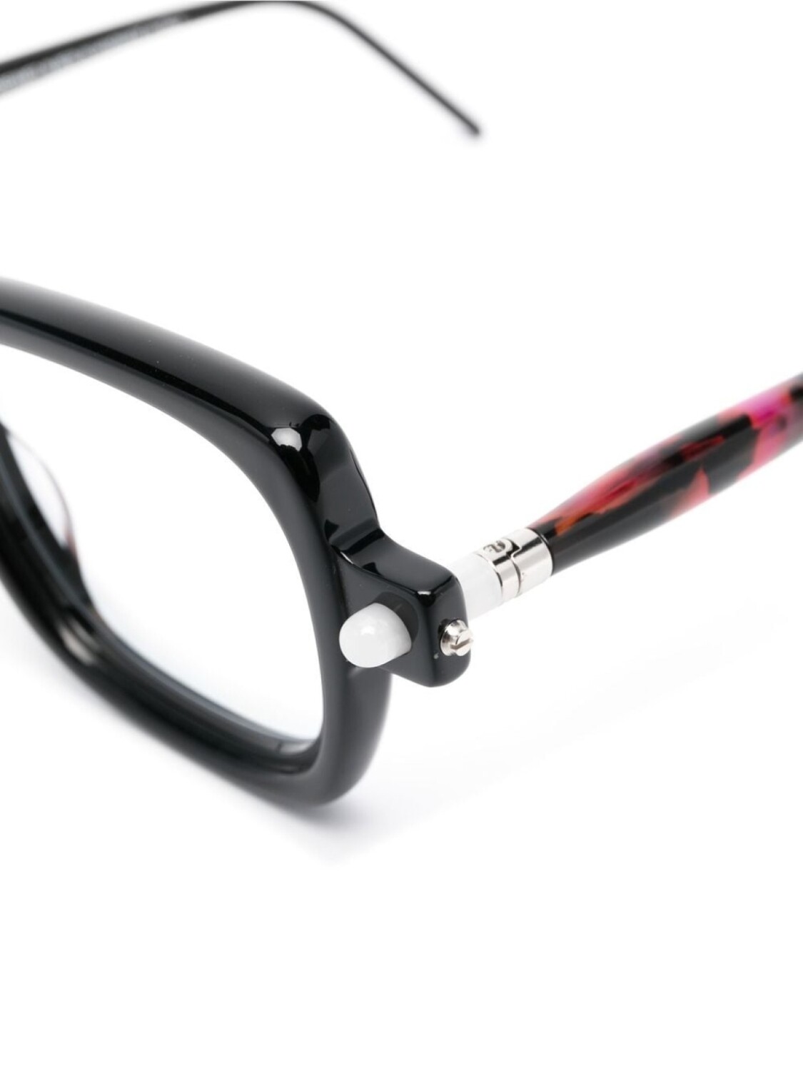 Черный, ацетат, квадратная оправа, прозрачные линзы, серебристая фурнитура, прямые дужки и дужки с закругленными концами. Обратите внимание, что на FARFETCH продаются оправы с линзами без диоптрий. В комплект входит защитный чехол для очков.