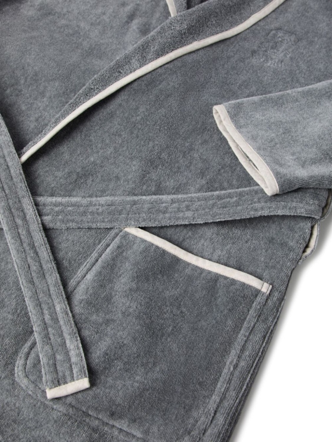 Темно-серый/светло-бежевый, хлопок, полотенечная ткань, вышитый логотип на груди, модель без застежки, контрастная отделка, лацканы-шалька, длинные рукава, съемный регулируемый ремень на талию, два накладных кармана спереди, прямой подол, Это унисекс-модель. Обратите внимание, что для нее используется мужская размерная сетка.