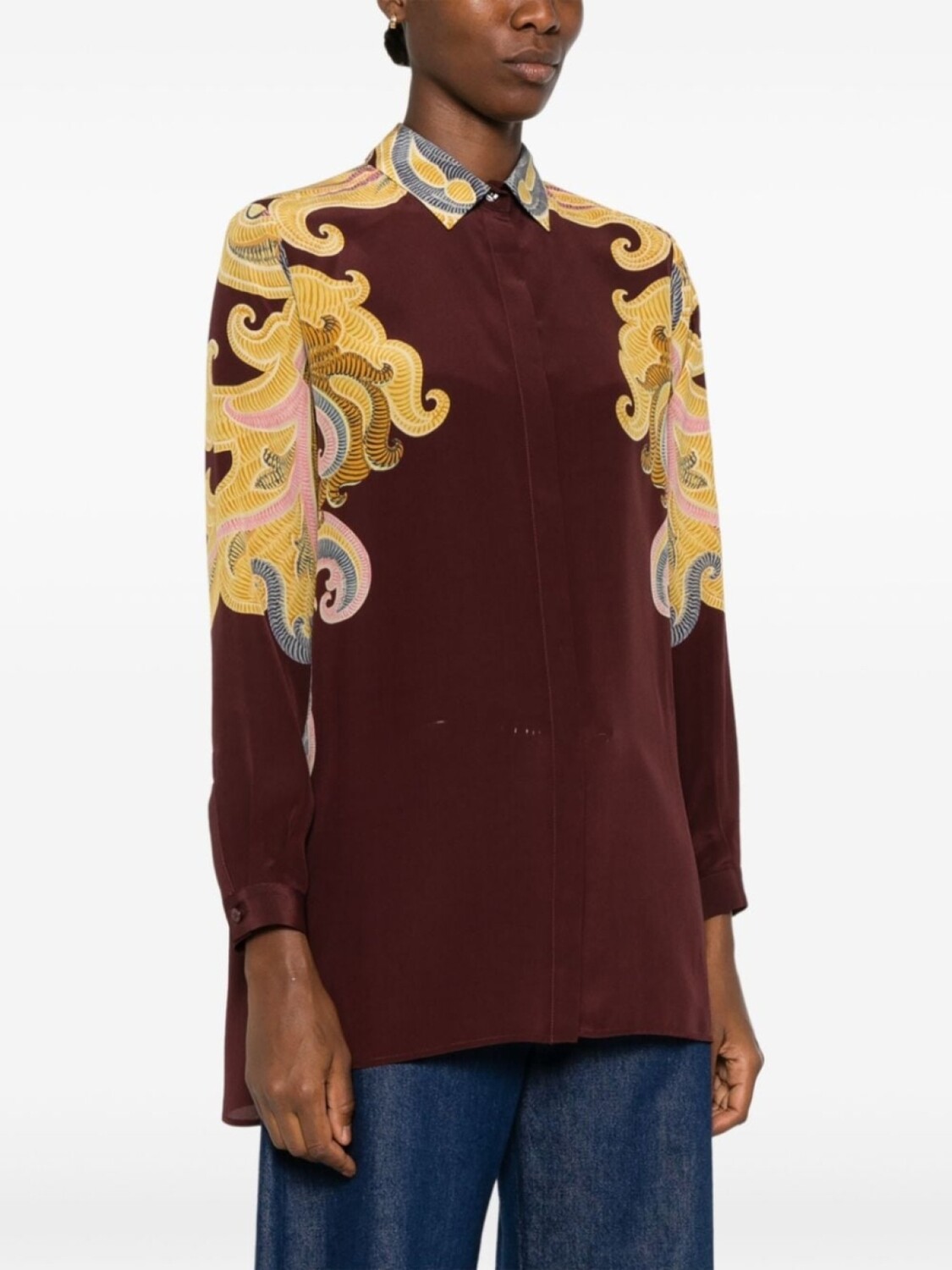 Бордовый/разноцветный, шелк, креповая текстура, принт пейсли, классический воротник, длинные рукава, манжеты на пуговицах, разрезы по бокам, встречная складка, манжеты со ступенчатой отделкой, потайная пуговичная застежка спереди