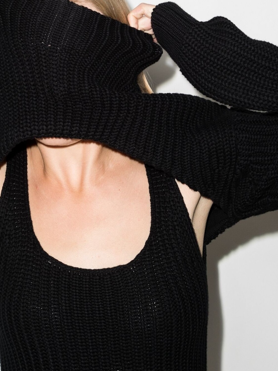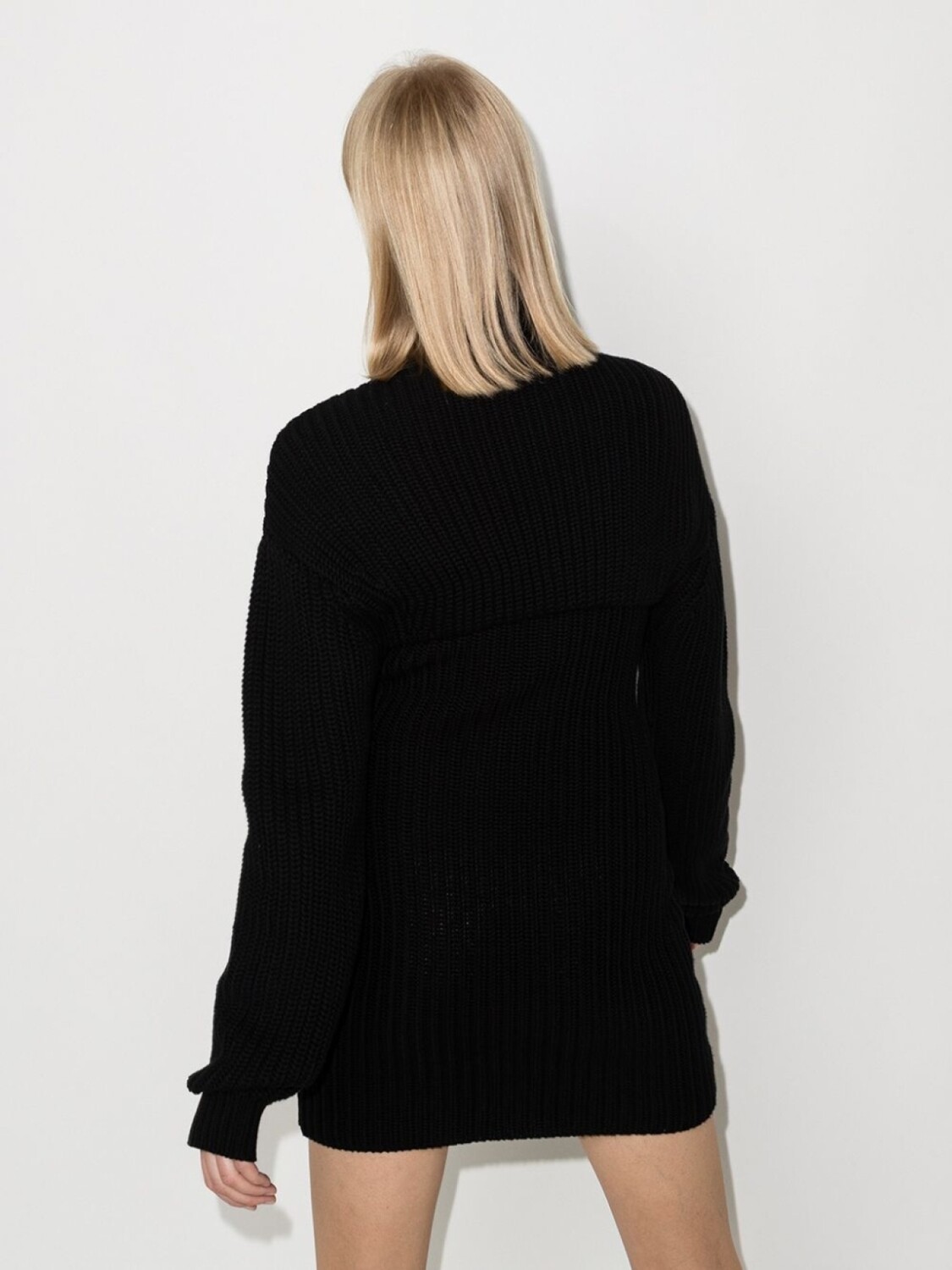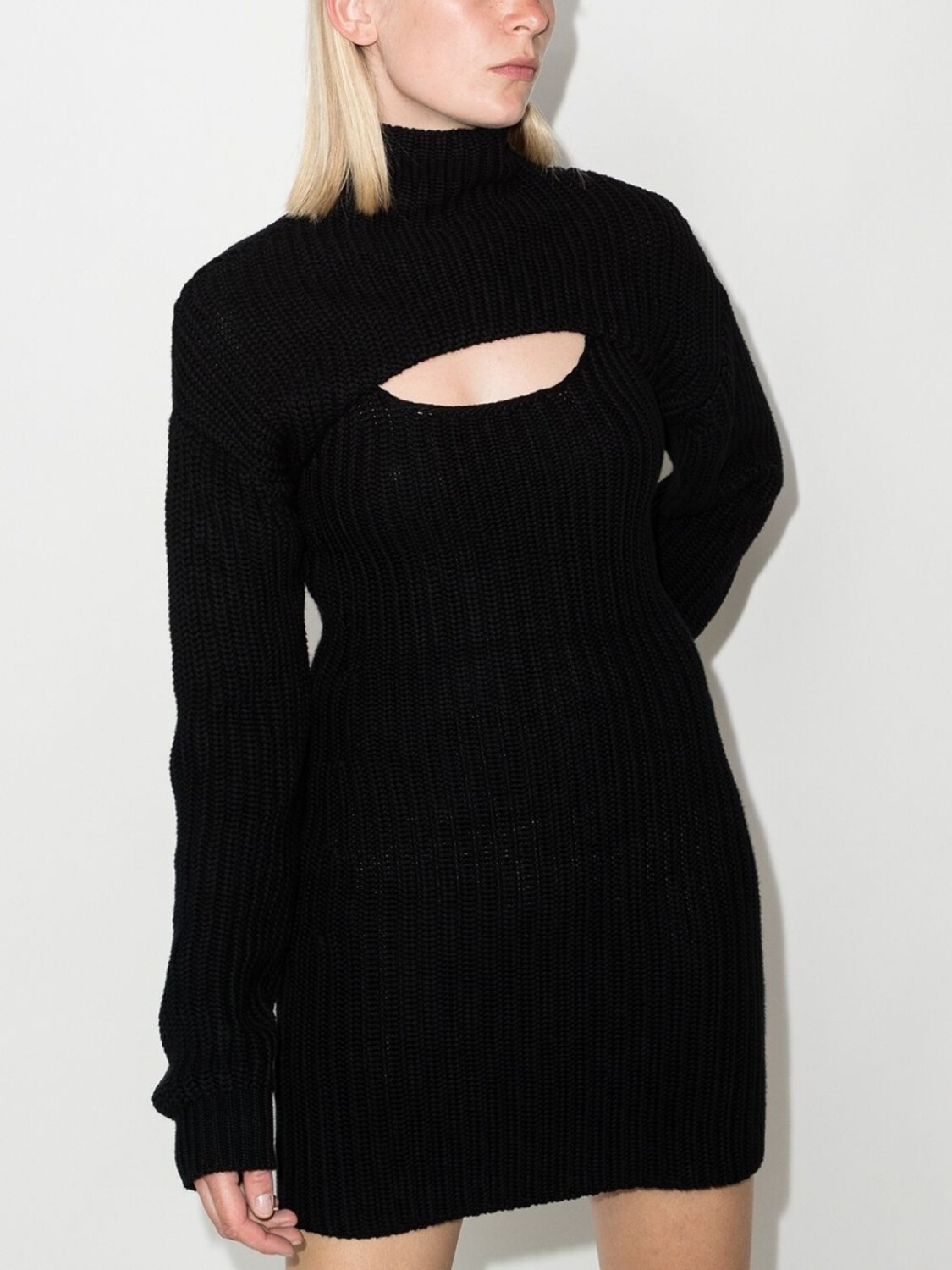 Высокий воротник, вырез с прорезью, прямой подол, вязаные края в рубчик и длинные рукава. Цвет: черный.