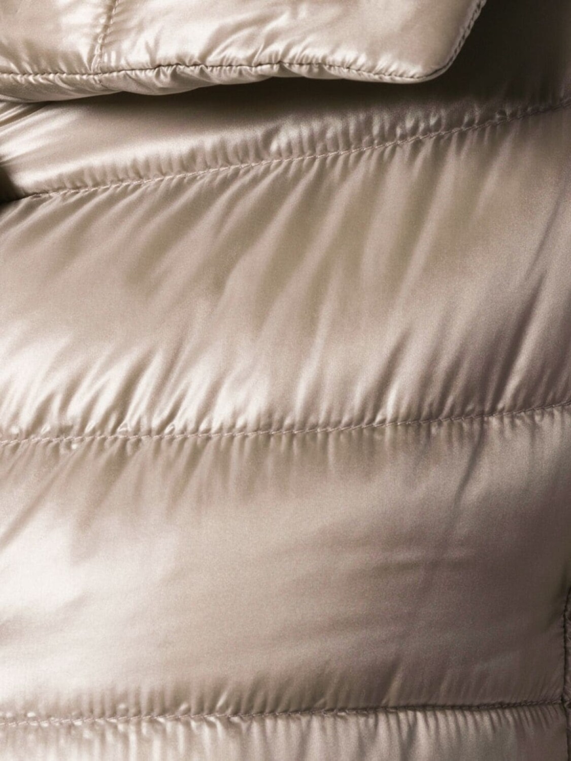 Пуховик Iconic Aminta от Herno. Классический воротник, потайная застежка, рукава три четверти, с обивкой, приталенный силуэт и металлический отблеск. Цвет: бежевый.